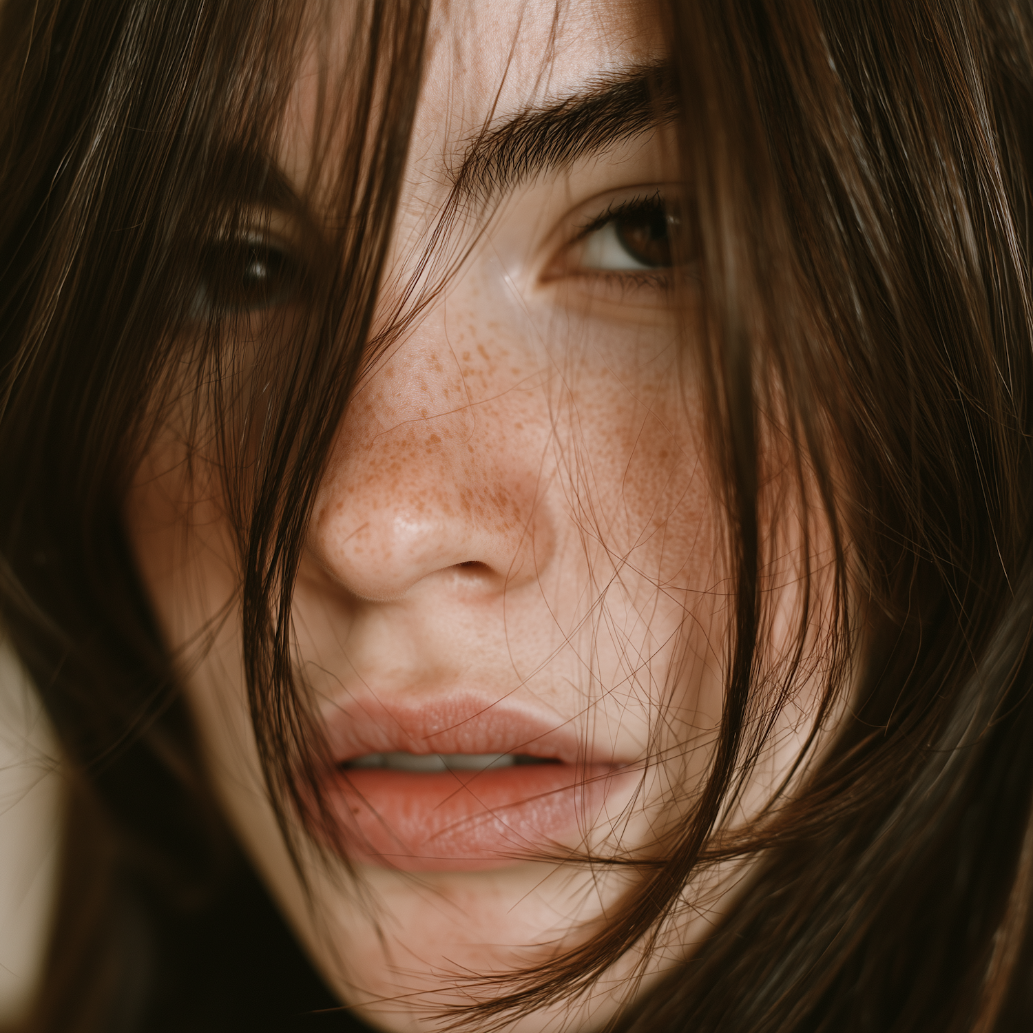 Close-up of a freckled face with dark hair partially covering the features, creating a natural and intimate portrait.