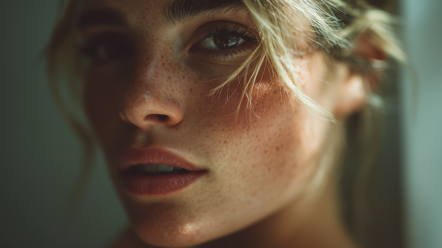 Close-up of a freckled face with soft lighting, highlighting natural beauty and texture, framed by light-colored hair strands.
