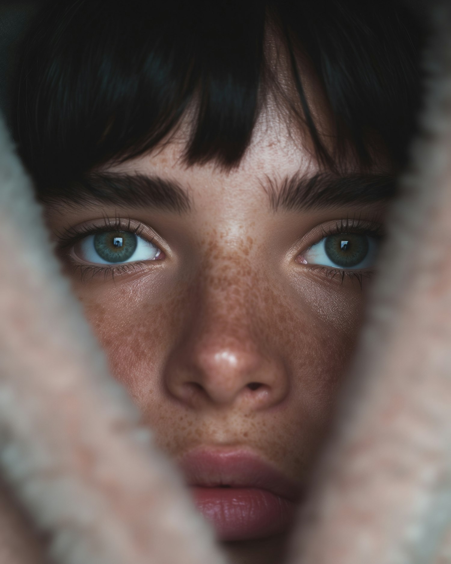 Close-up of a freckled face with greenish-blue eyes framed by soft fabric, creating an intimate and cozy atmosphere.