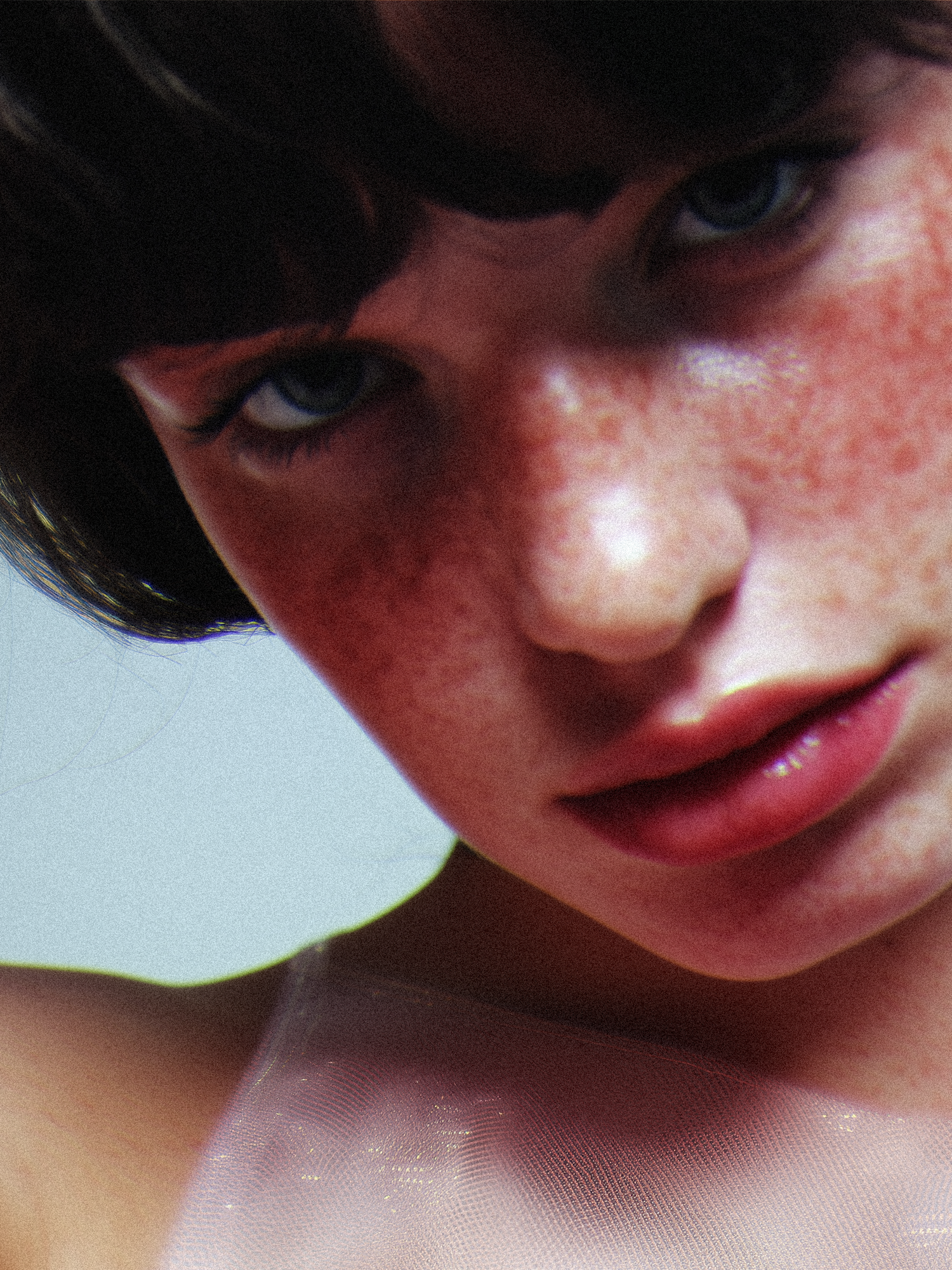 Close-up portrait of a freckled individual with blue eyes and short dark hair, showcasing natural beauty and soft lighting.