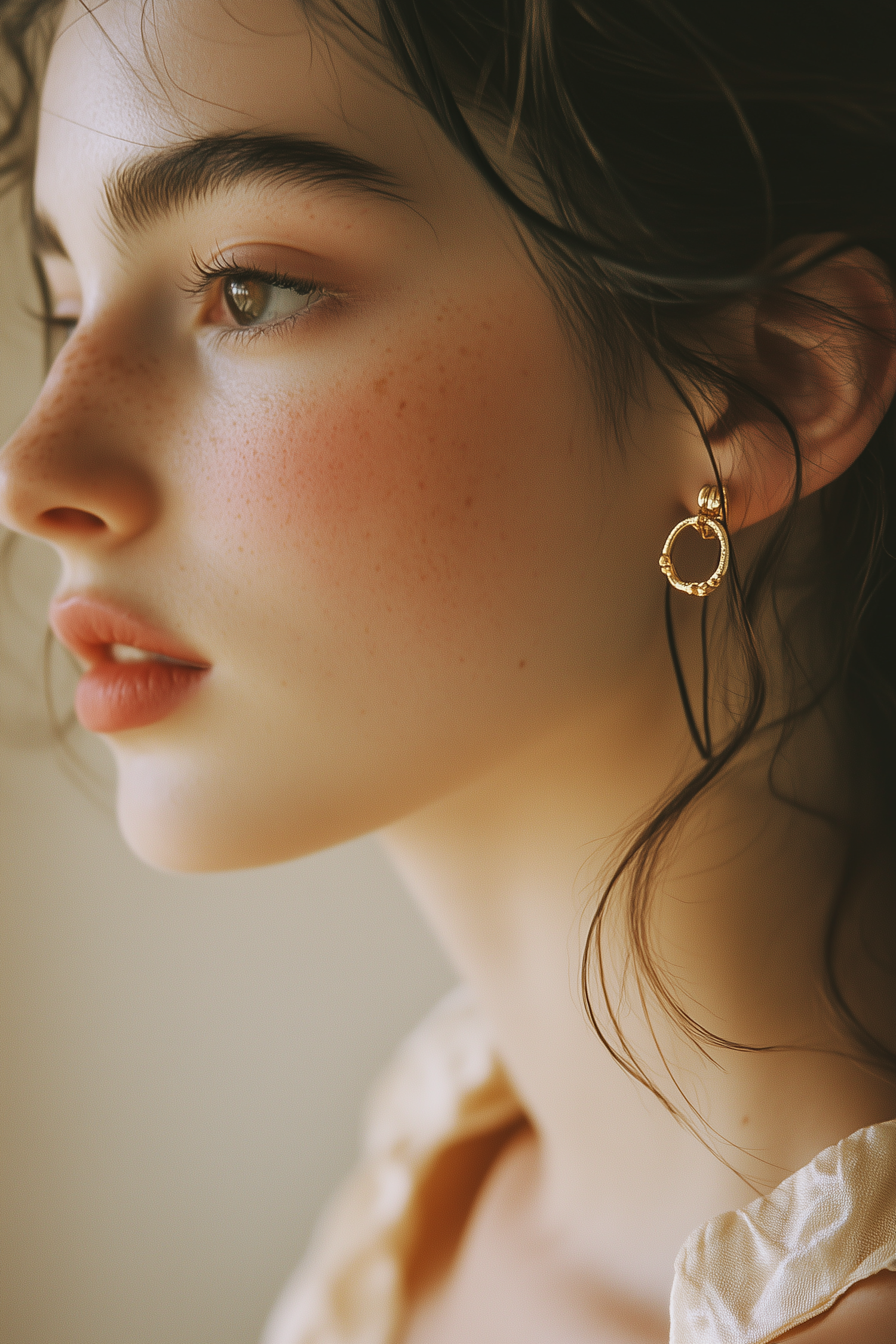Close-up of a young woman with freckles, gold hoop earrings, and soft makeup, highlighting her natural beauty and delicate features.