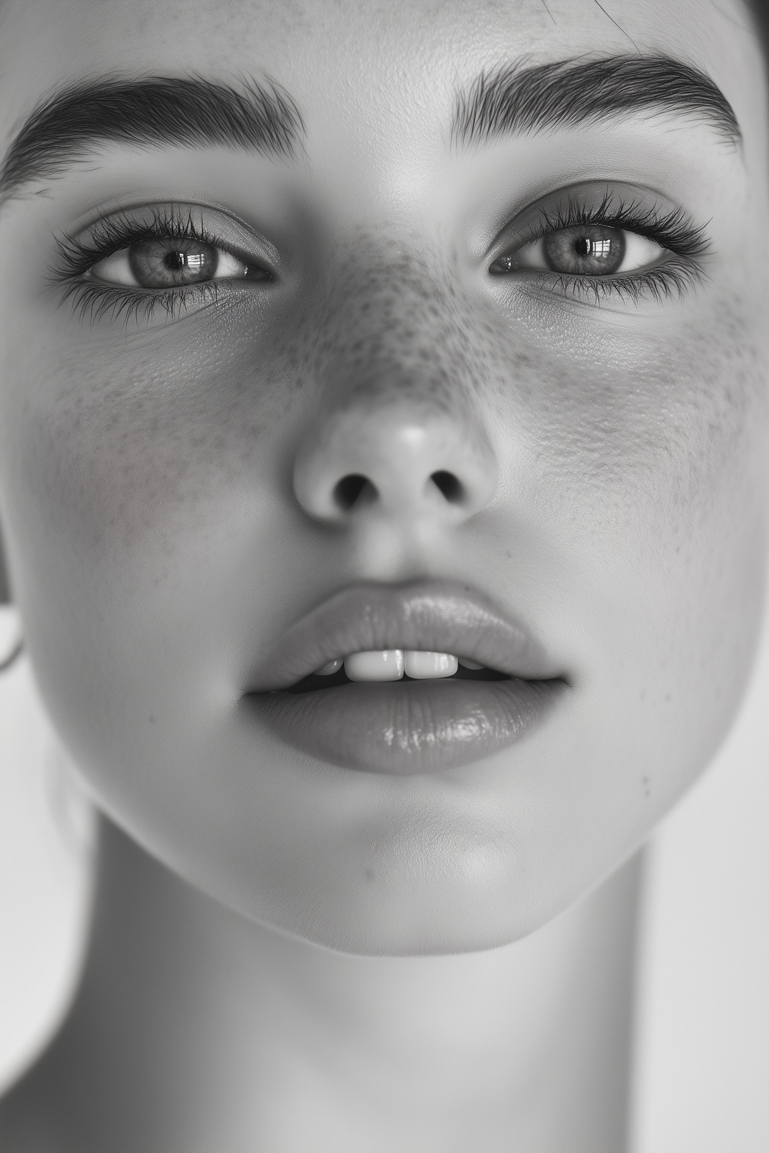 Black-and-white close-up of a freckled woman with parted lips and intense gaze, highlighting her natural beauty and smooth complexion.