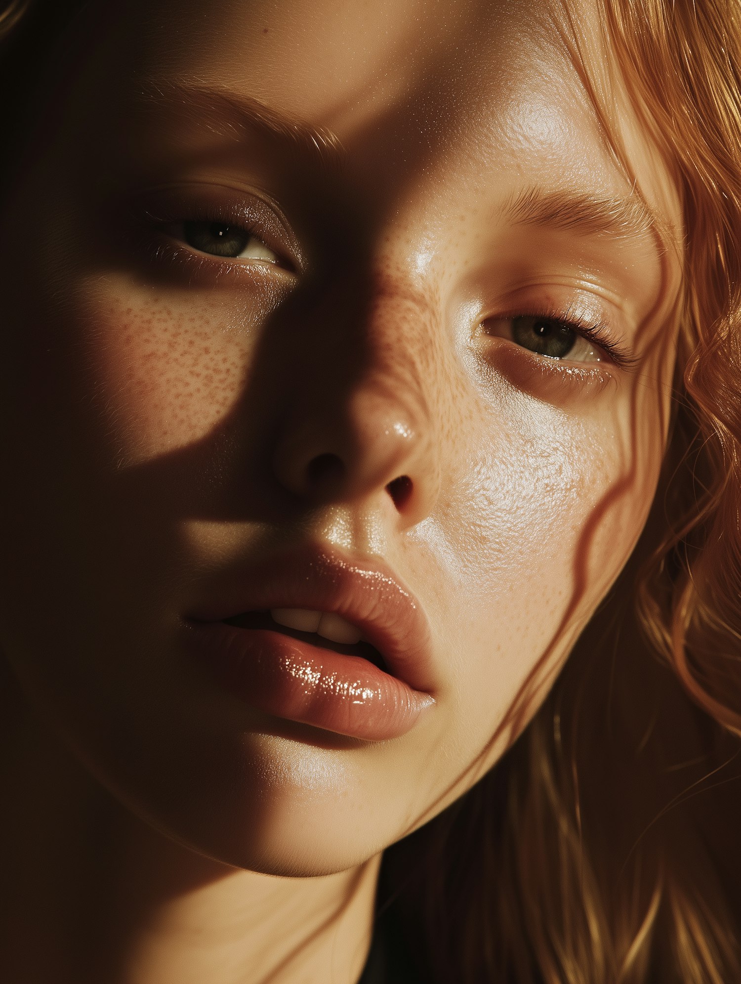 Close-up of a freckled woman with green eyes, glossy lips, and auburn hair in warm natural light, creating a dramatic, intimate mood.