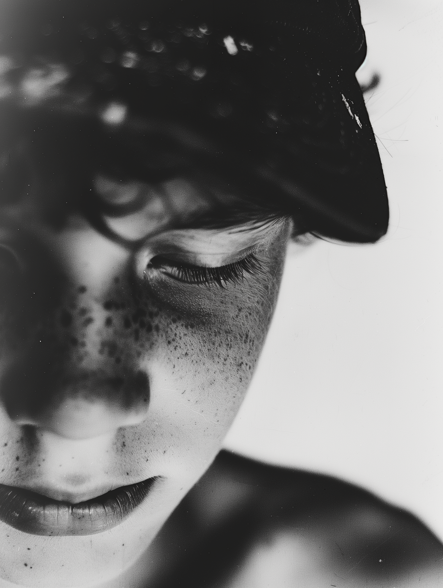 Black-and-white close-up of a freckled face with closed eyes, wearing a dark hat. The serene mood and soft lighting create an intimate feel.