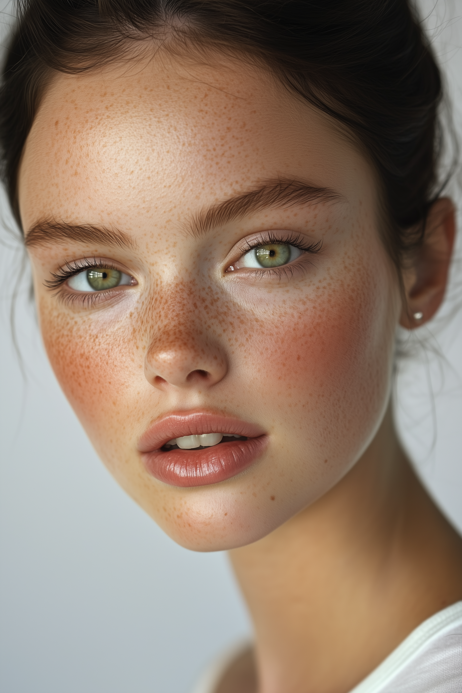 Close-up of a freckled woman with green eyes, natural makeup, and dark hair pulled back, set against a soft, blurred background.