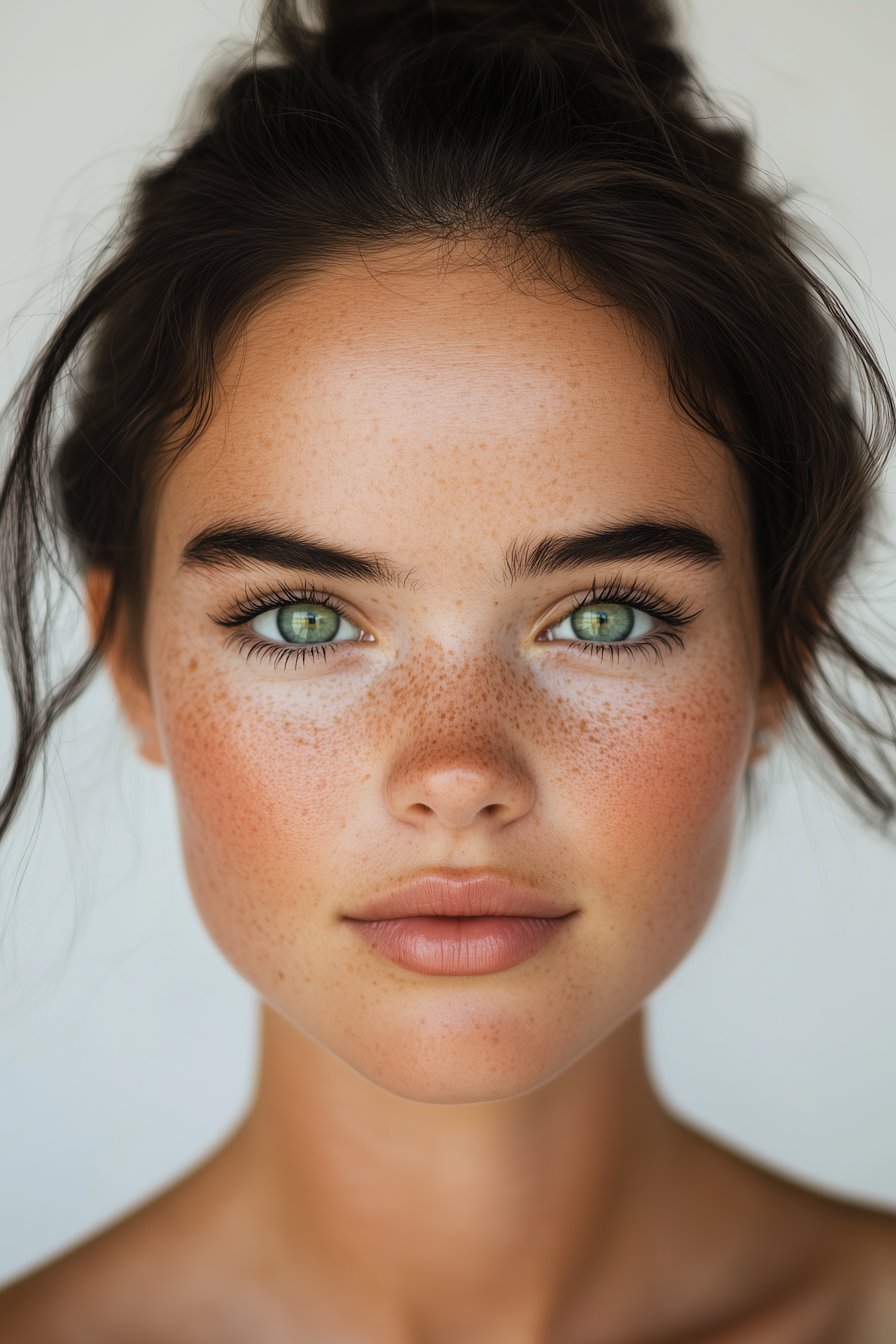Close-up of a freckled woman with green eyes, dark brown hair, and natural makeup, set against a softly blurred background.