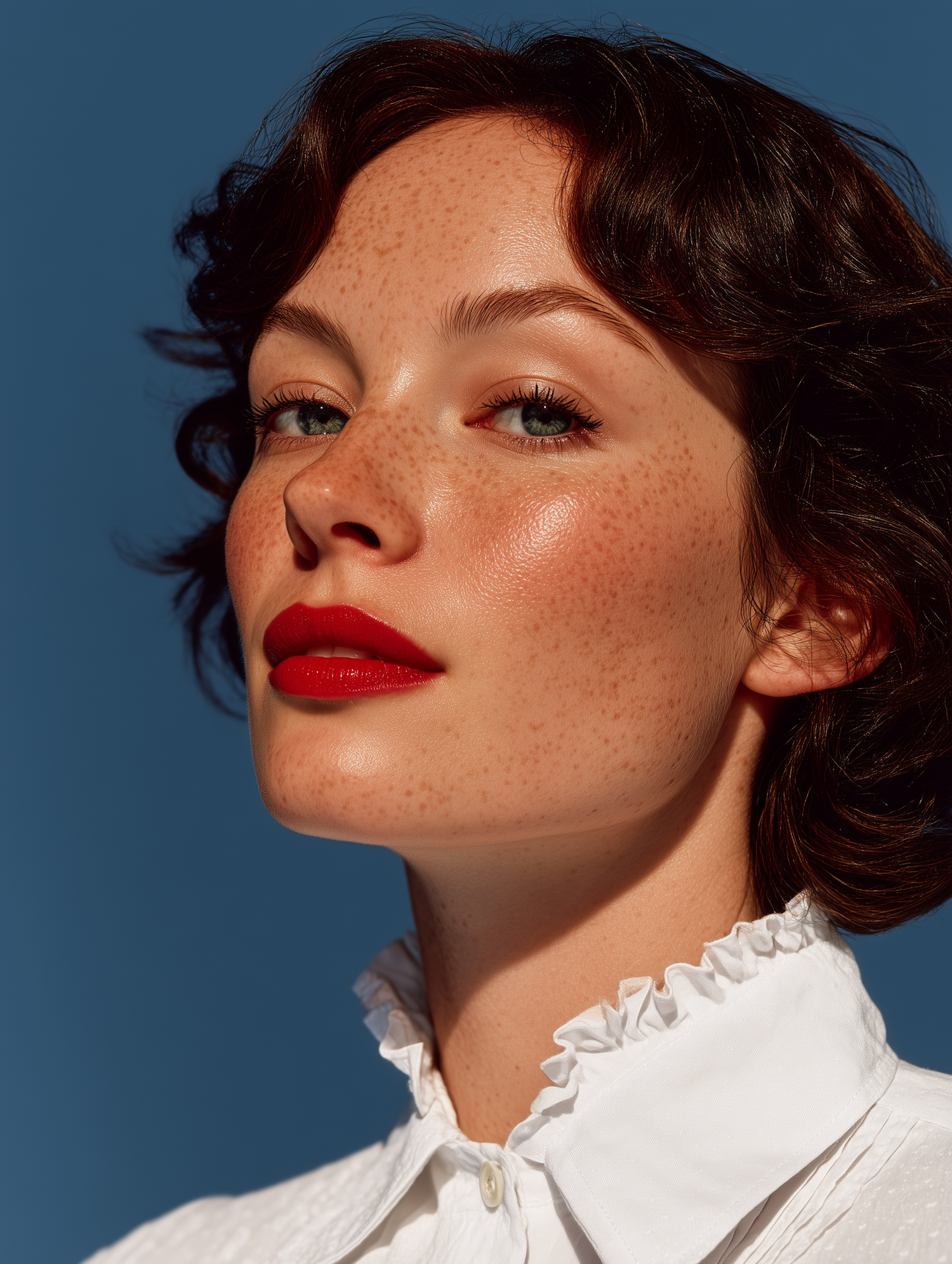 Close-up of a freckled woman with bold red lips, green eyes, and a white ruffled blouse against a clean blue background.