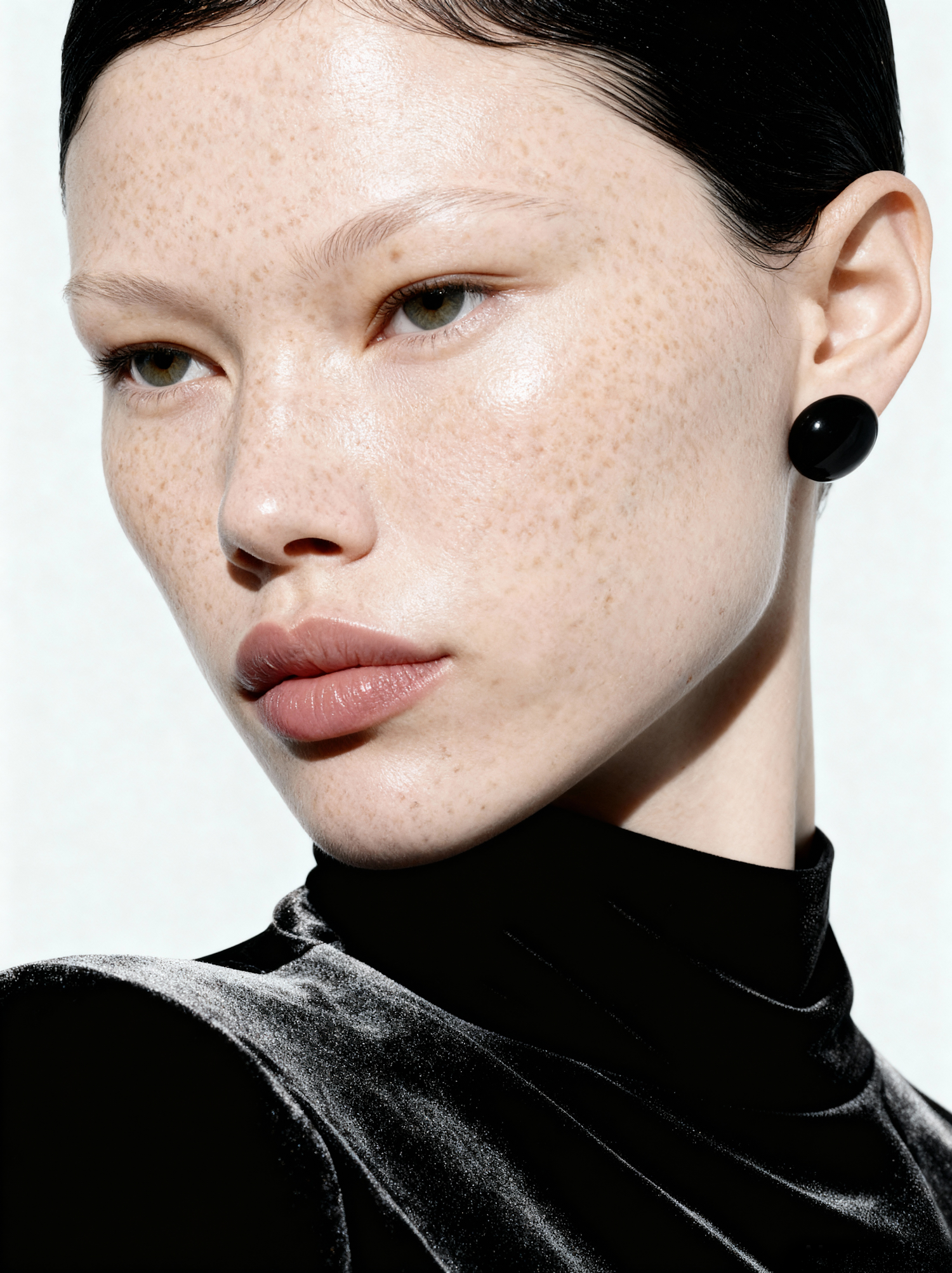 Close-up of a person with fair skin, freckles, and sleek black hair, wearing a black high-neck garment and black circular earrings.