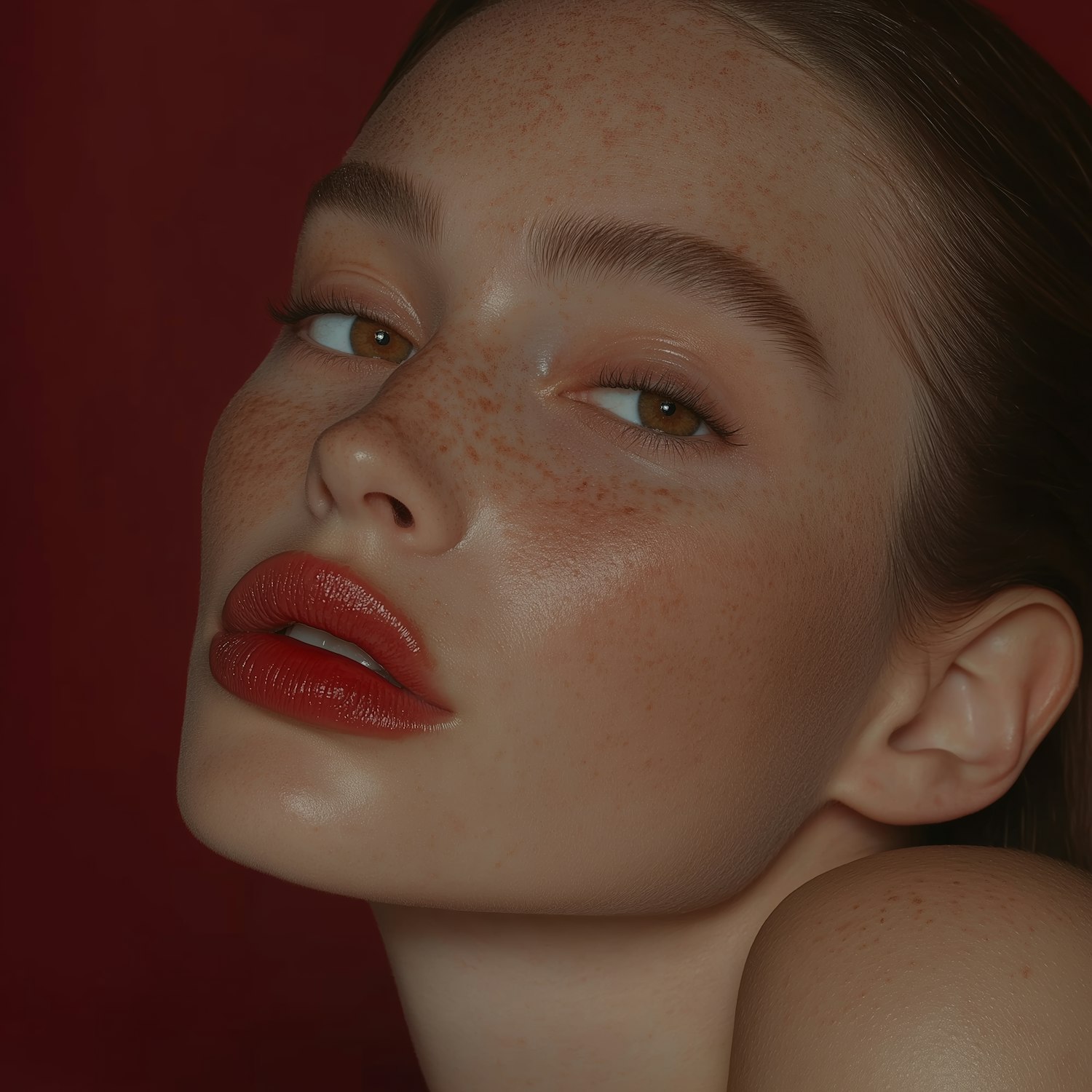 Close-up of a freckled individual with glossy red lips and luminous skin against a deep red background.