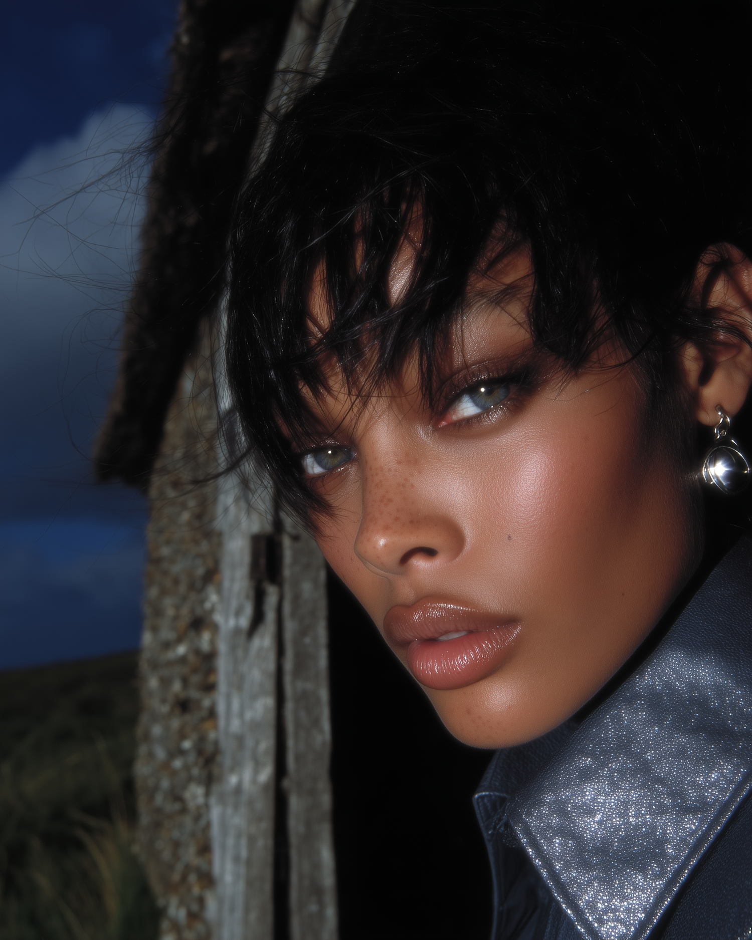 Close-up of a person with striking light eyes, freckles, and a metallic-textured jacket, set against a rustic outdoor backdrop.