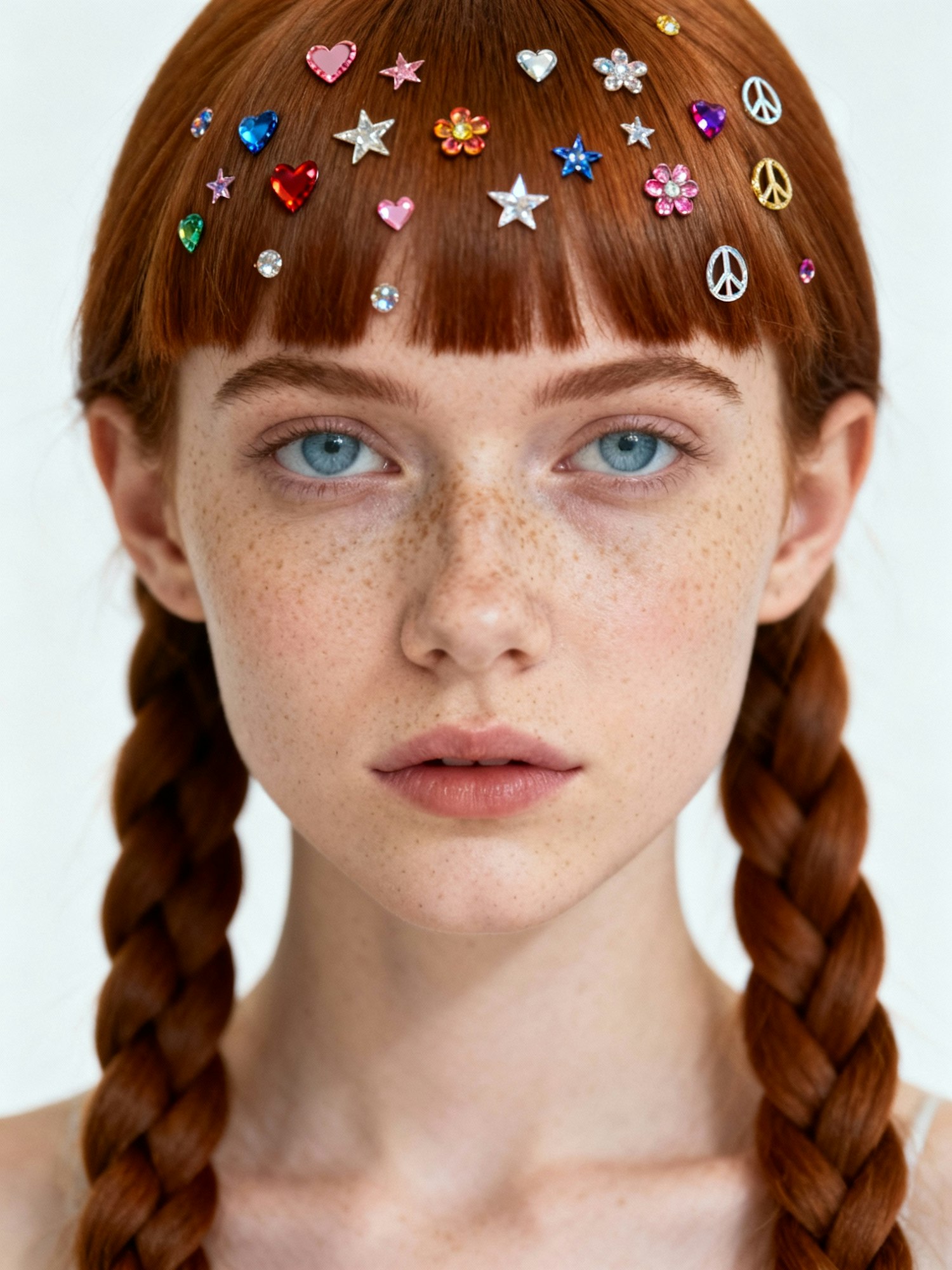 Studio portrait, plain white seamless background, soft even lighting, clean editorial aesthetic, no shadows, high detail, realistic photography, sharp focus on face and hair accessories Close-up of a young woman with pale freckled skin, straight auburn hair styled in two long braids with blunt baby bangs, icy blue eyes, neutral expression. She looks straight at the camera. Her bangs are covered with colorful rhinestone stickers arranged into small hearts, stars, flowers, and peace symbols scattered across the hairline, giving a playful and retro effect.