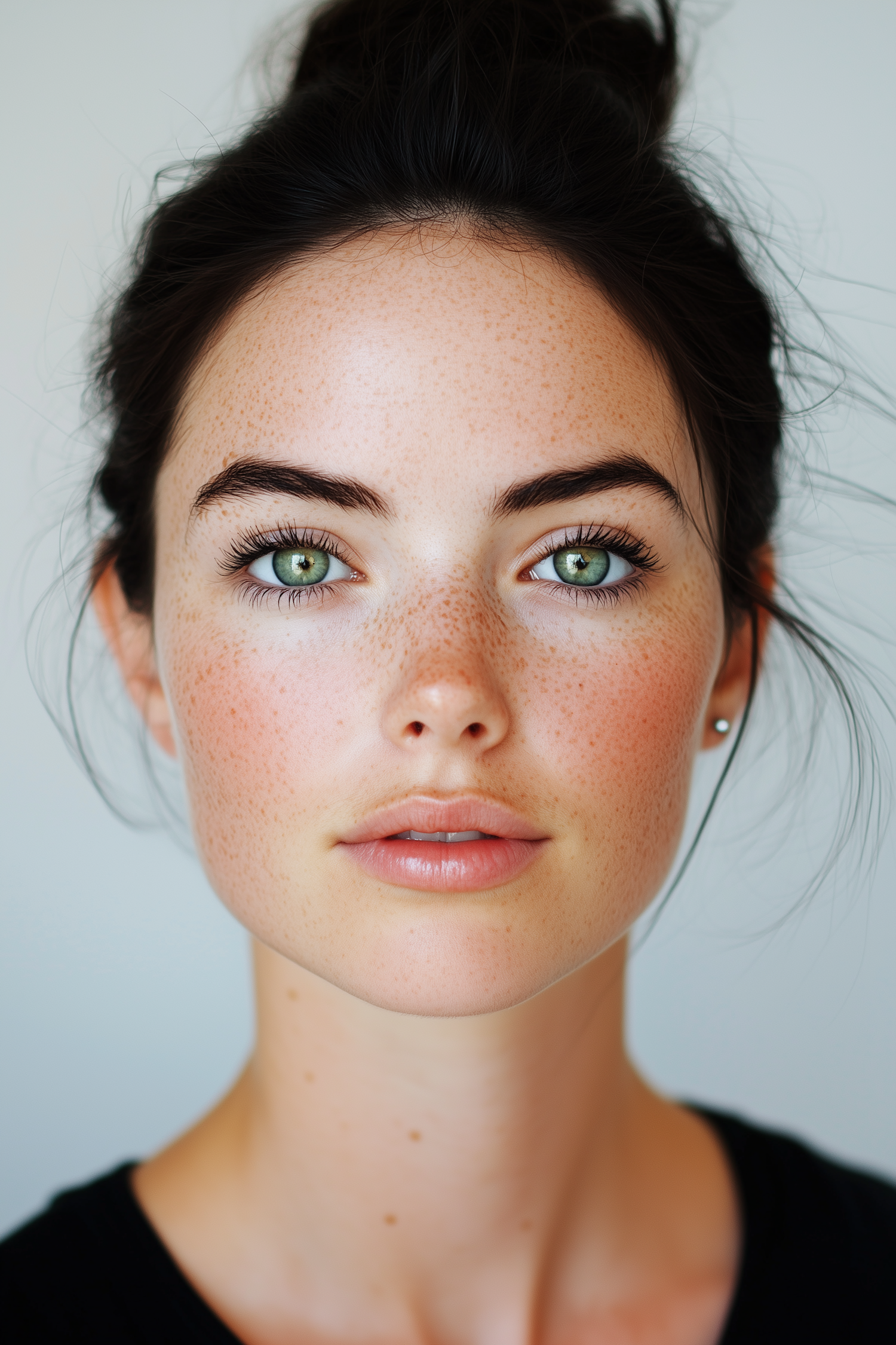 Close-up of a freckled woman with green eyes, dark hair in a bun, and natural makeup, set against a neutral gray background.