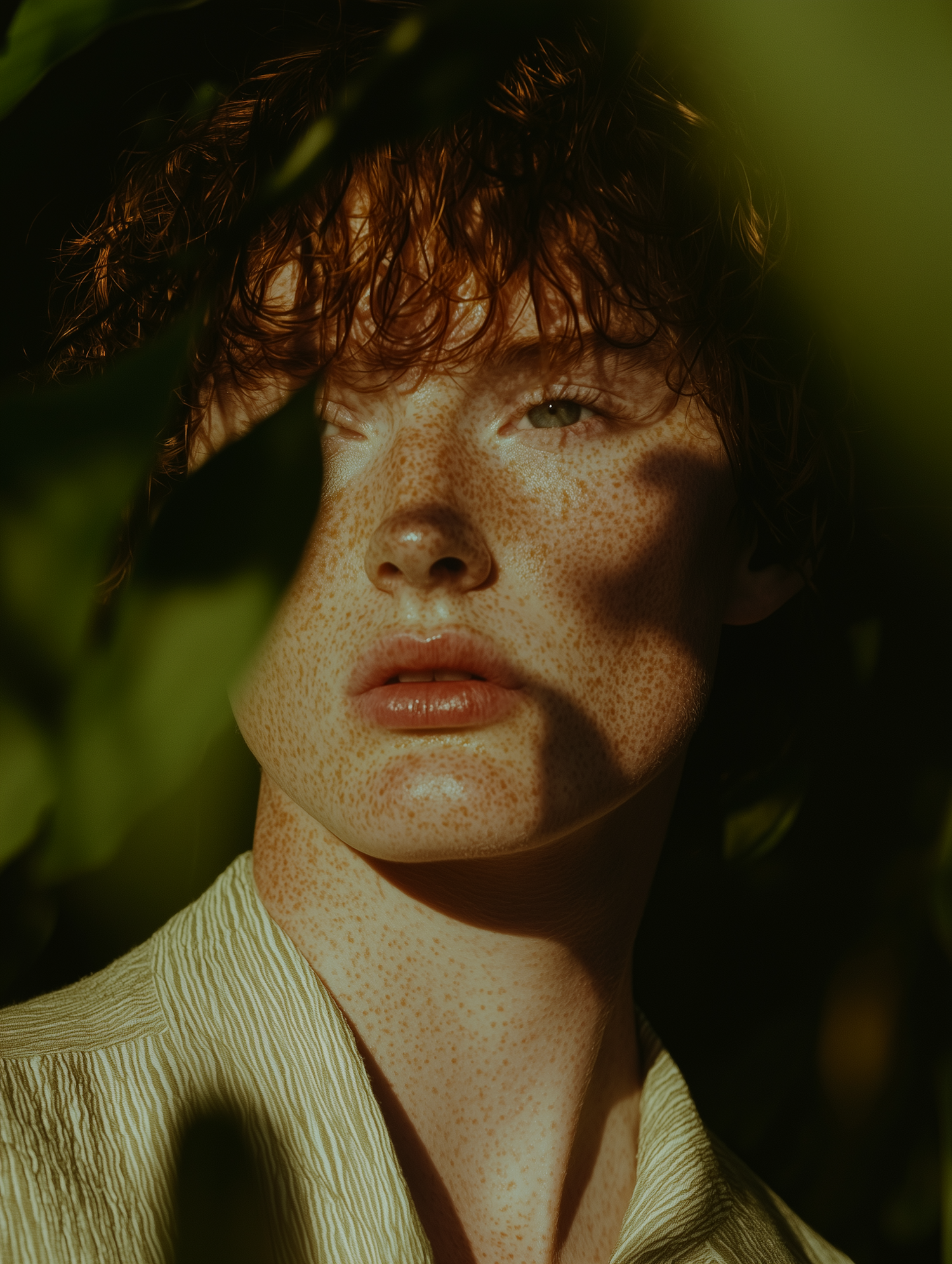 Close-up portrait of a freckled person with curly red hair, green eyes, and a serene expression, framed by soft-focus green leaves.