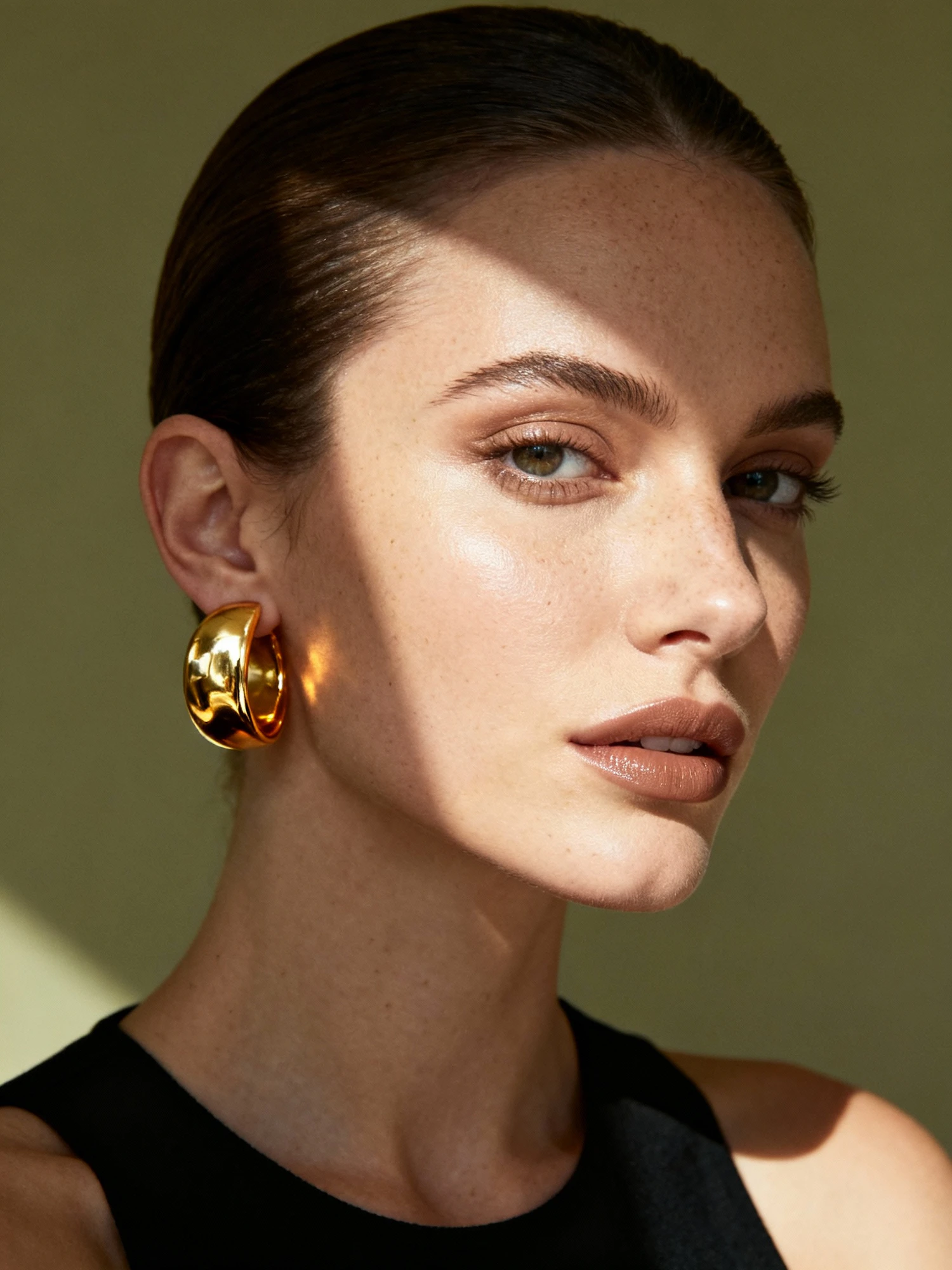 editorial jewelry photography, fine jewelry, minimalistic composition, soft natural light, high-end luxury aesthetic, shallow depth of field, neutral clean backdrop, warm and muted tones, cinematic shadows, ultra-realistic details — half-body portrait of a woman wearing bold molten gold ear cuffs and a black minimal sleeveless top, warm olive-toned background, sharp side lighting casting sculptural shadows on her face and shoulders, slicked hair pulled back, skin with realistic pores and glow, neutral makeup, jewelry highly polished and reflecting warm light