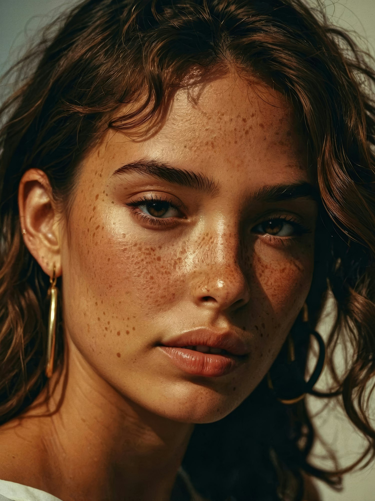 Close-up portrait of a freckled woman with wavy brown hair and gold hoop earrings, exuding natural beauty and confidence.