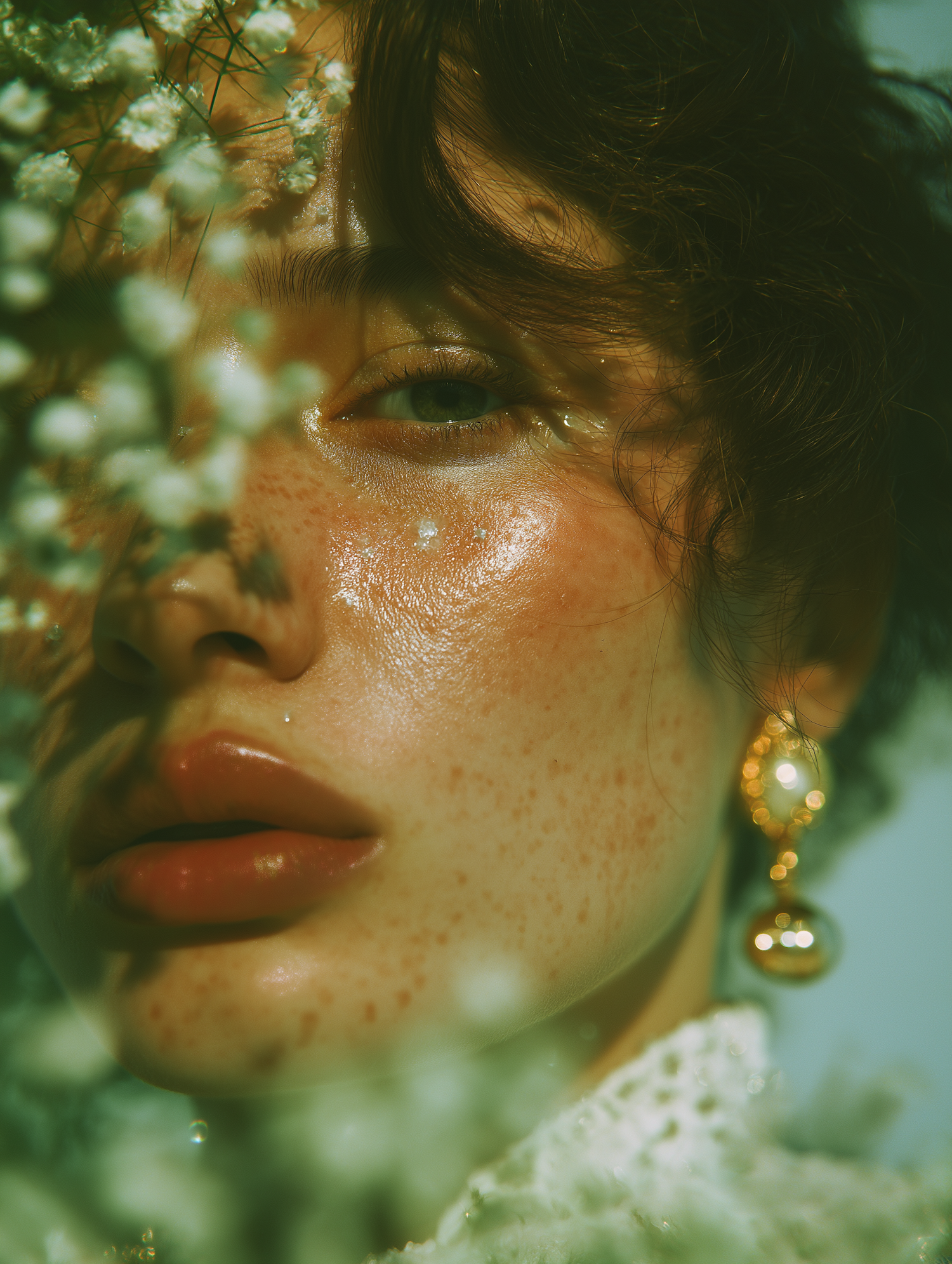 Close-up of a freckled face with gold earrings, surrounded by delicate white flowers, glowing in soft natural light.
