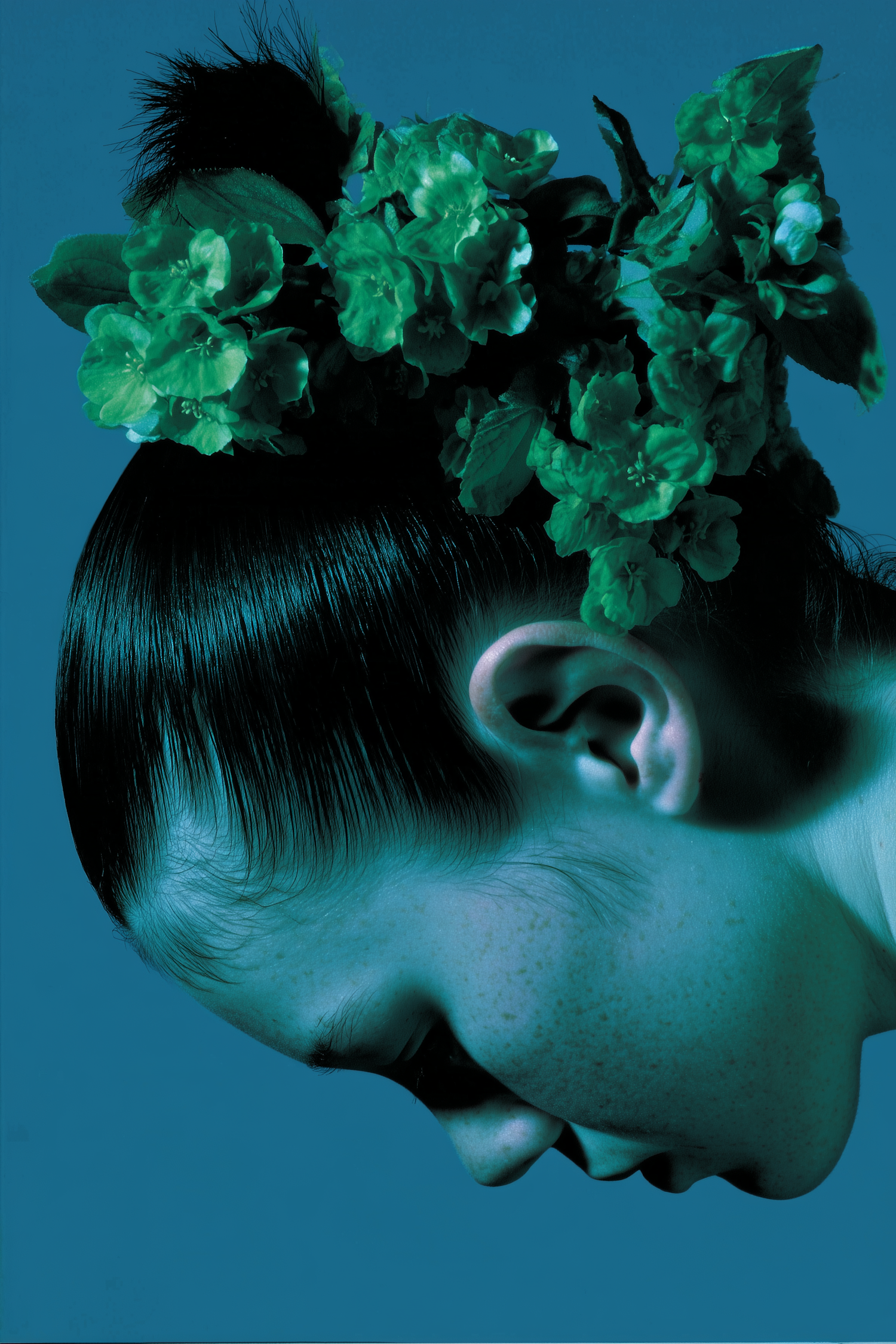 A striking portrait of a person with a floral hairpiece against a blue background, showcasing vibrant green flowers and sleek styling.