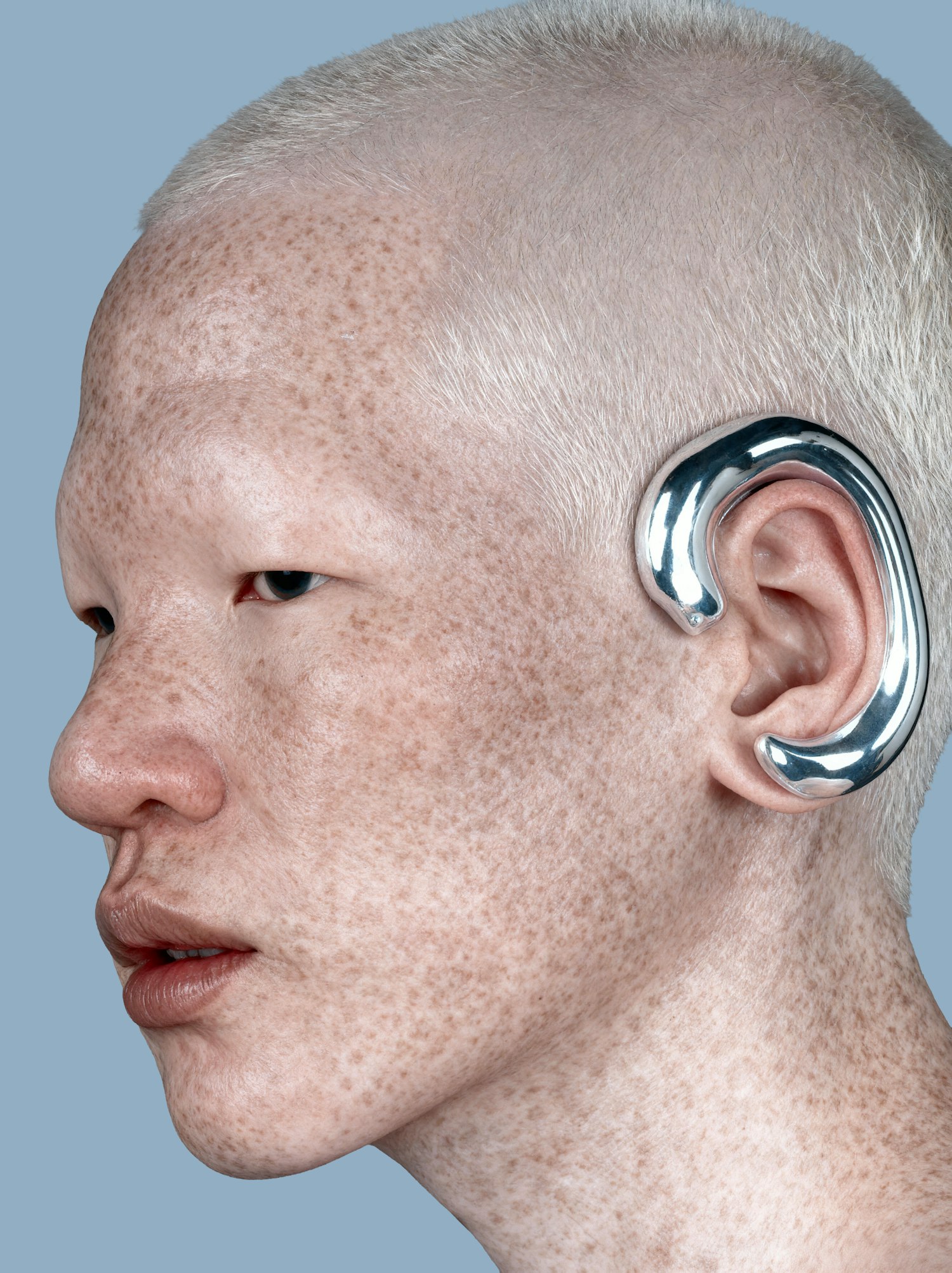 Close-up of a freckled individual with a metallic ear accessory, short light hair, and a neutral expression against a light blue background.