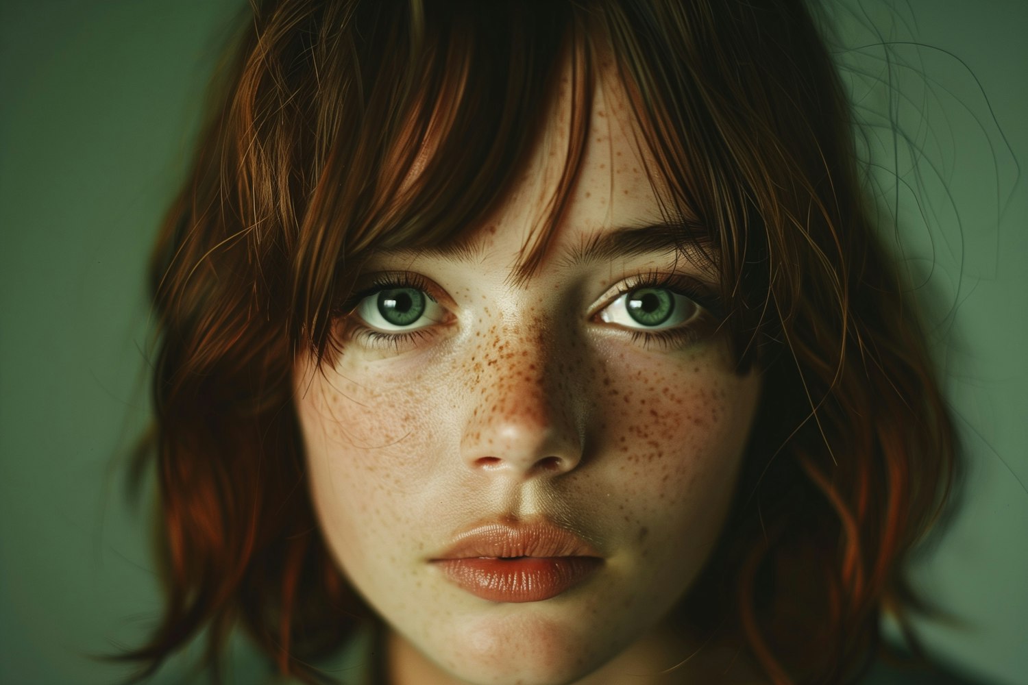 Close-up of a freckled young woman with green eyes, auburn hair, and soft lighting against a muted green background.