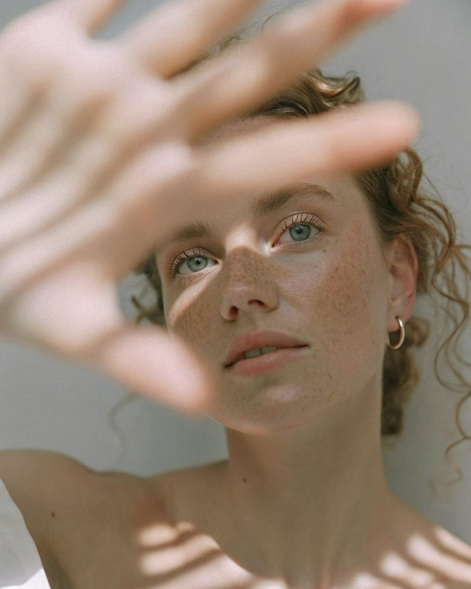Close-up of a freckled woman with light blue eyes, curly hair, and sunlight casting shadows on her face and hand. Calm and introspective vibe.