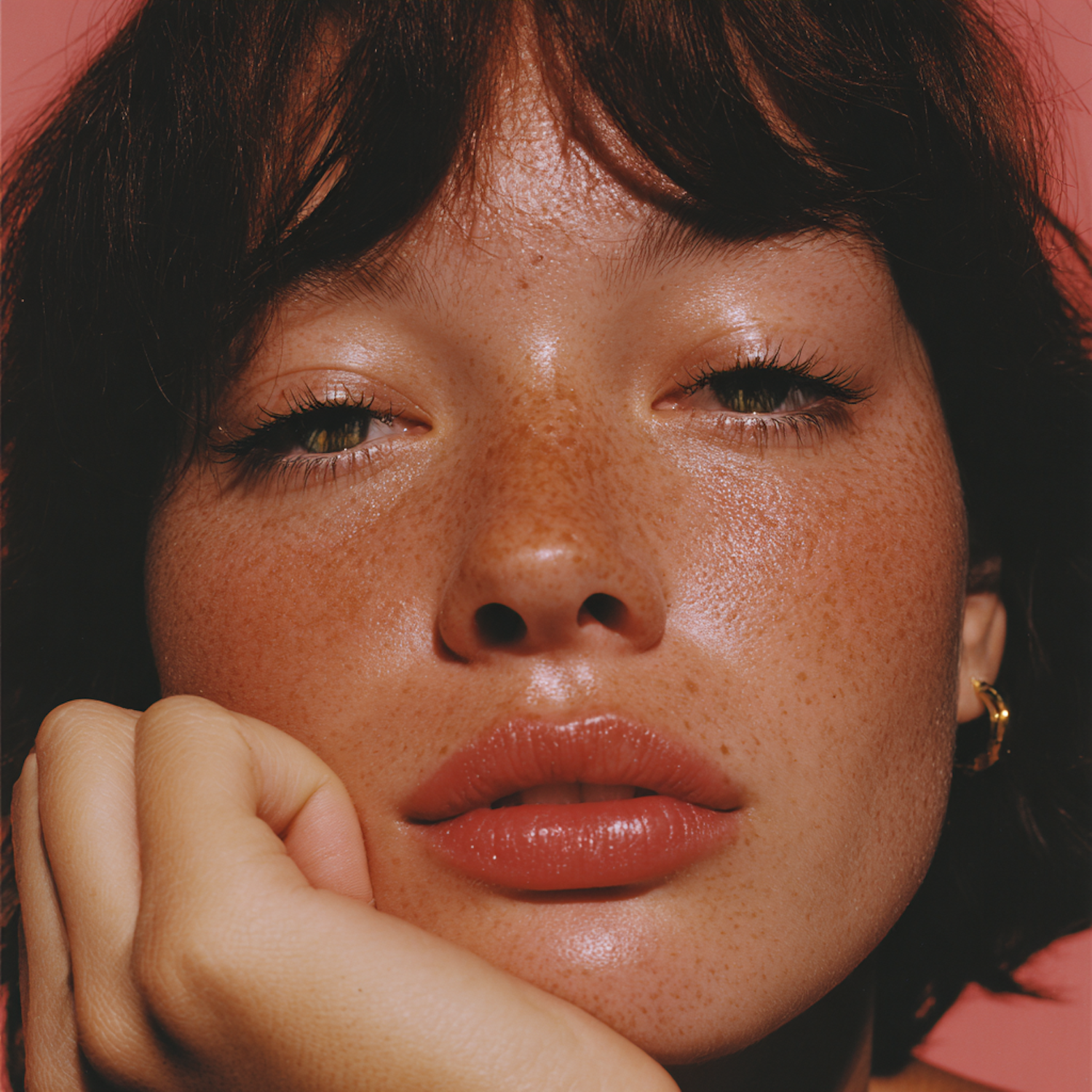 Close-up portrait of a freckled individual with auburn hair against a pink background, showcasing natural beauty and a relaxed expression.