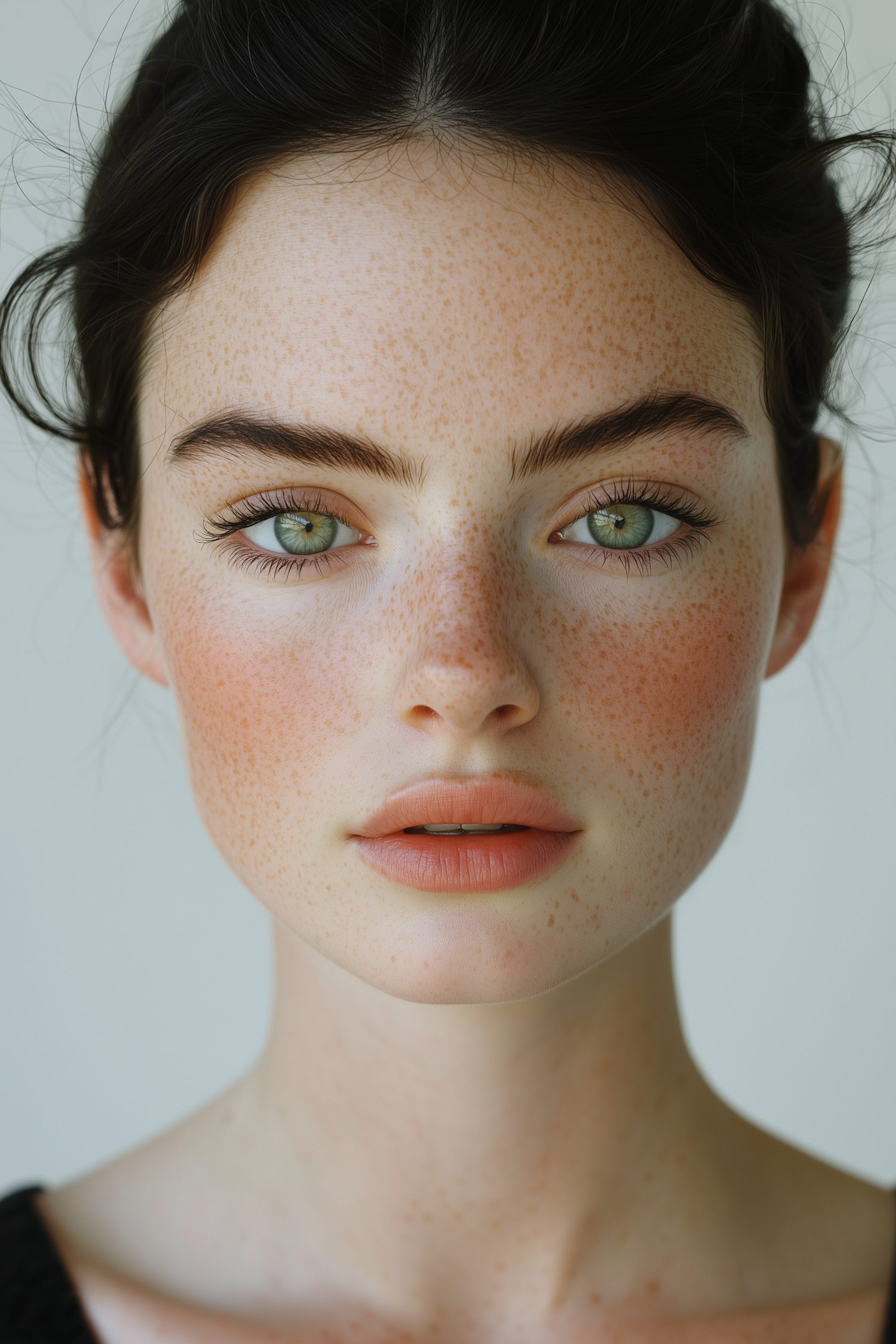 Close-up of a freckled woman with green eyes, peach lips, and dark hair, set against a softly lit background.