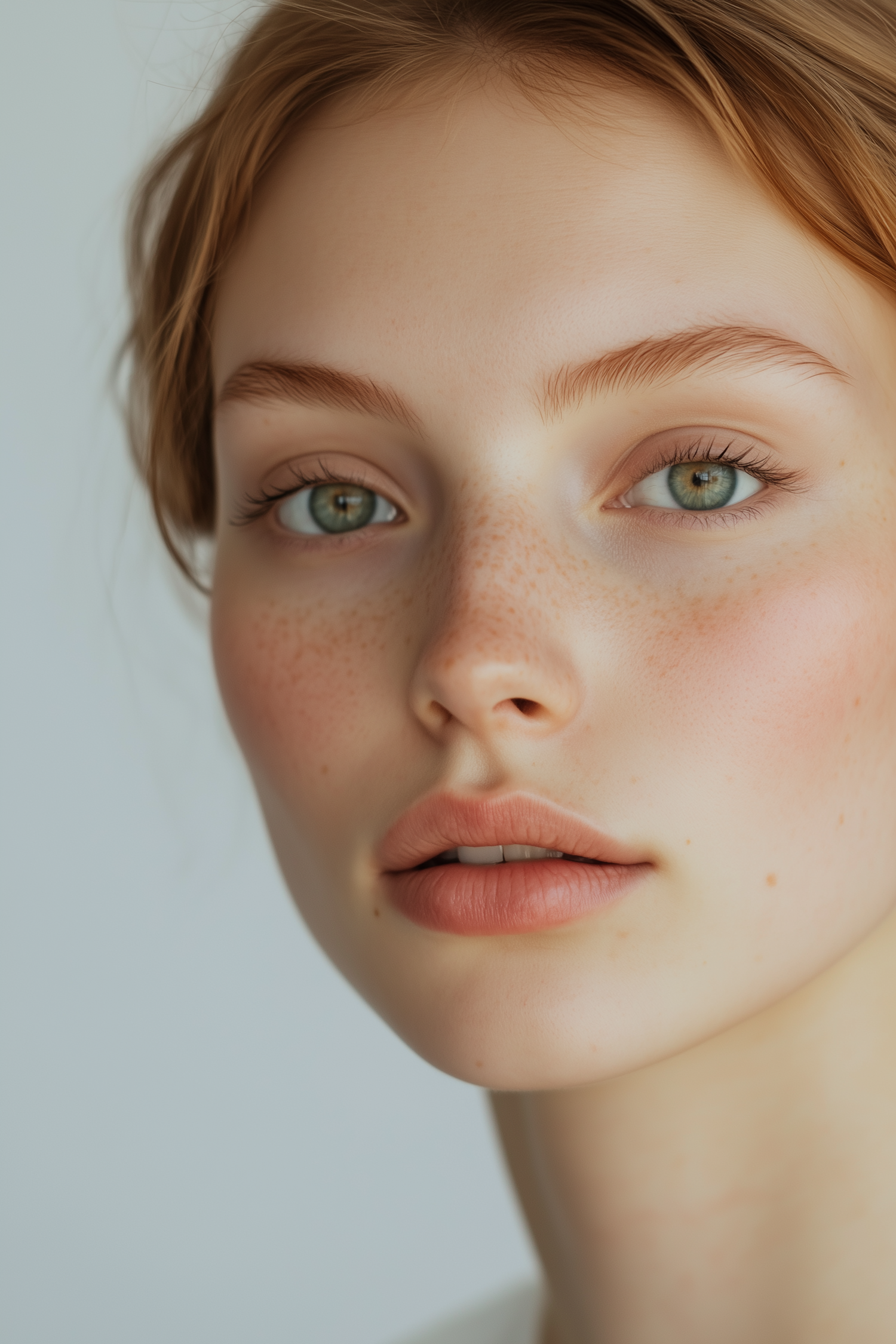 Close-up of a young woman with green eyes, freckles, and auburn hair, showcasing her natural beauty against a soft neutral background.