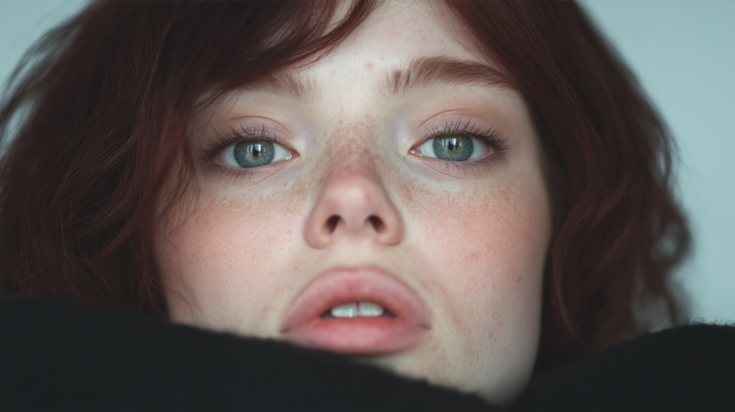 Close-up of a young woman with freckles, green eyes, and auburn hair, set against a soft blue background. Natural and serene vibe.