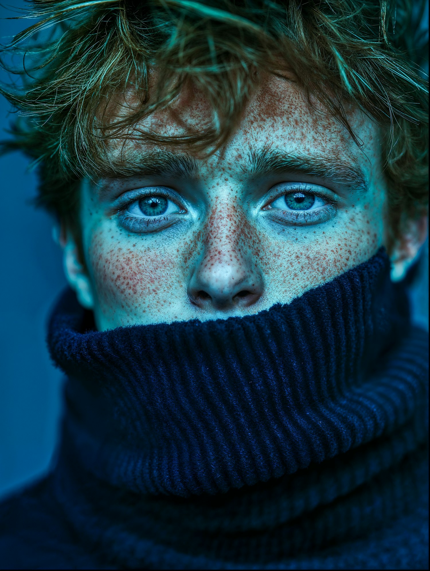 Mysterious portrait with tousled light brown hair and dark blue turtleneck, set against a deep blue background.
