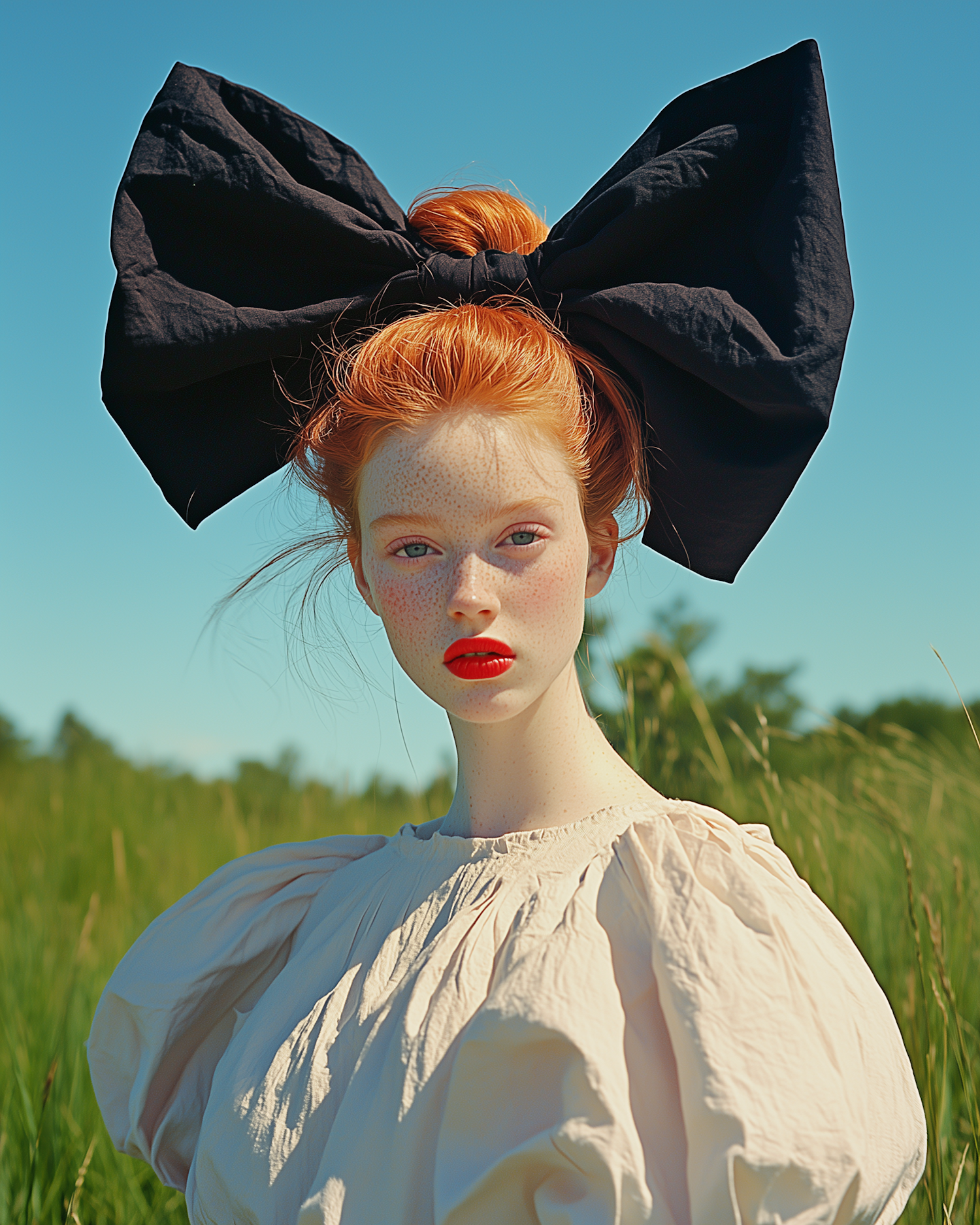A freckled woman with red hair, bold red lips, and a dramatic black bow poses in a cream blouse against a vibrant blue sky and green field.