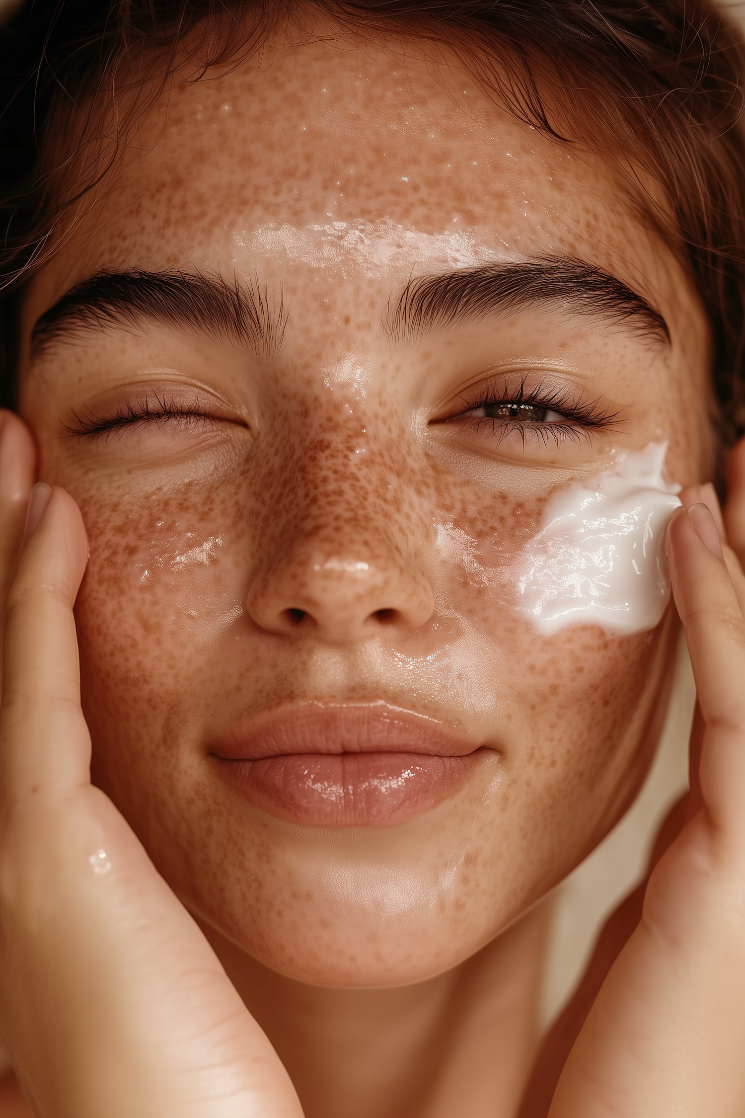 Close-up of a freckled woman applying skincare cream, showcasing glowing, hydrated skin and a serene expression.