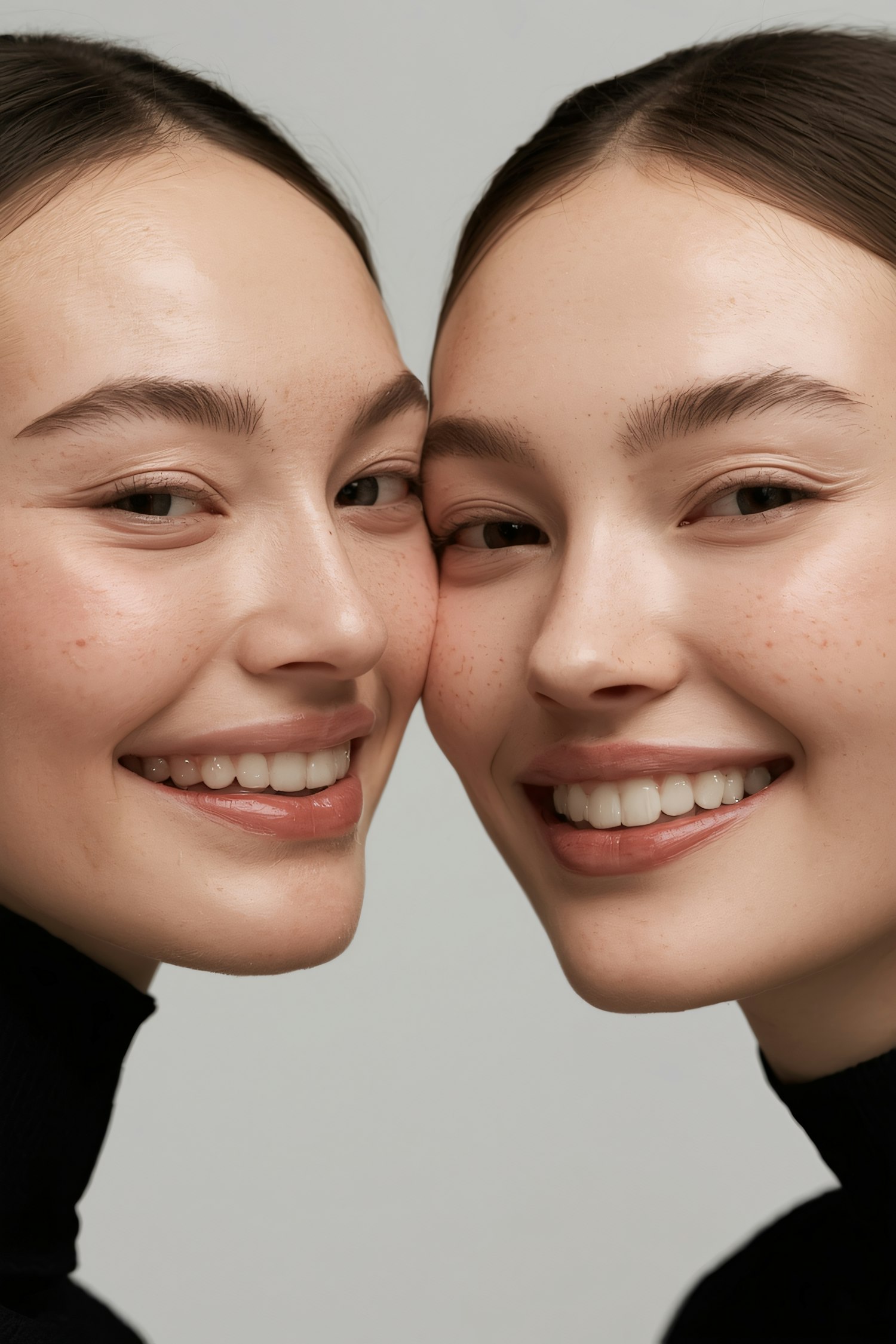 Two smiling individuals with fair skin and freckles, closely positioned, wearing black tops against a neutral background.