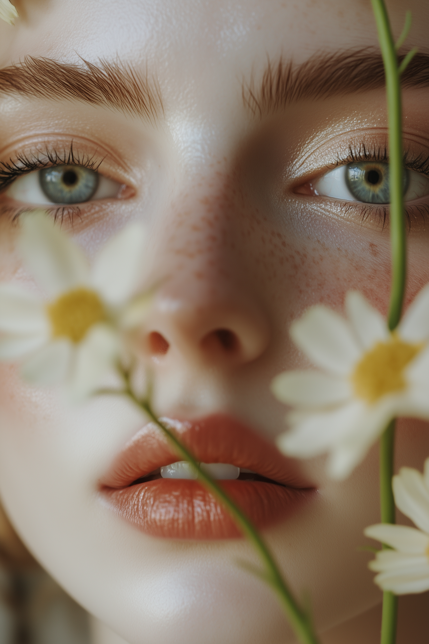 Close-up of a freckled face with blue eyes, glossy coral lips, and daisies in the foreground, creating a soft and natural aesthetic.