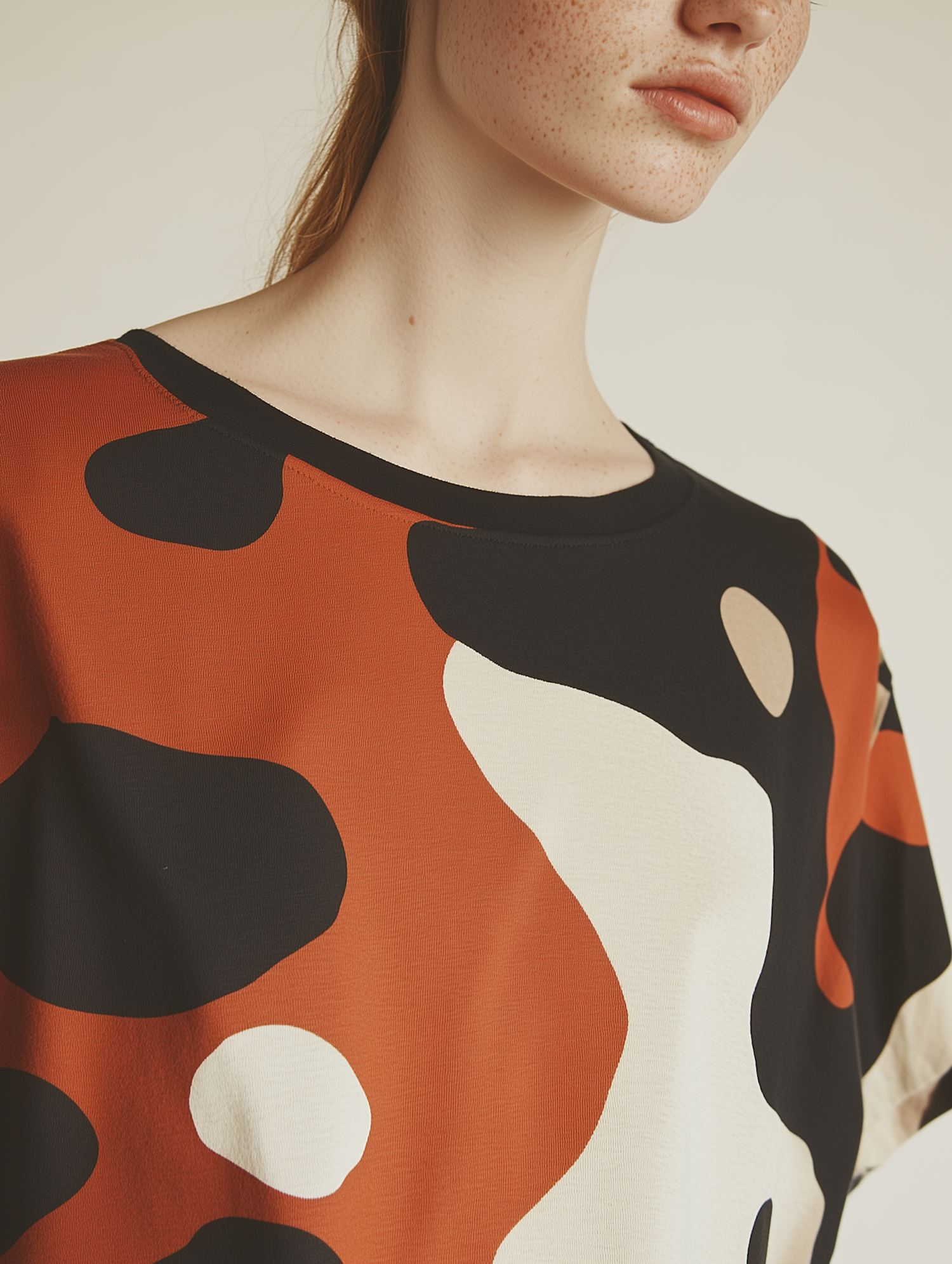 Close-up of a freckled woman wearing a bold abstract-patterned top in black, white, and burnt orange. Minimalist and stylish aesthetic.
