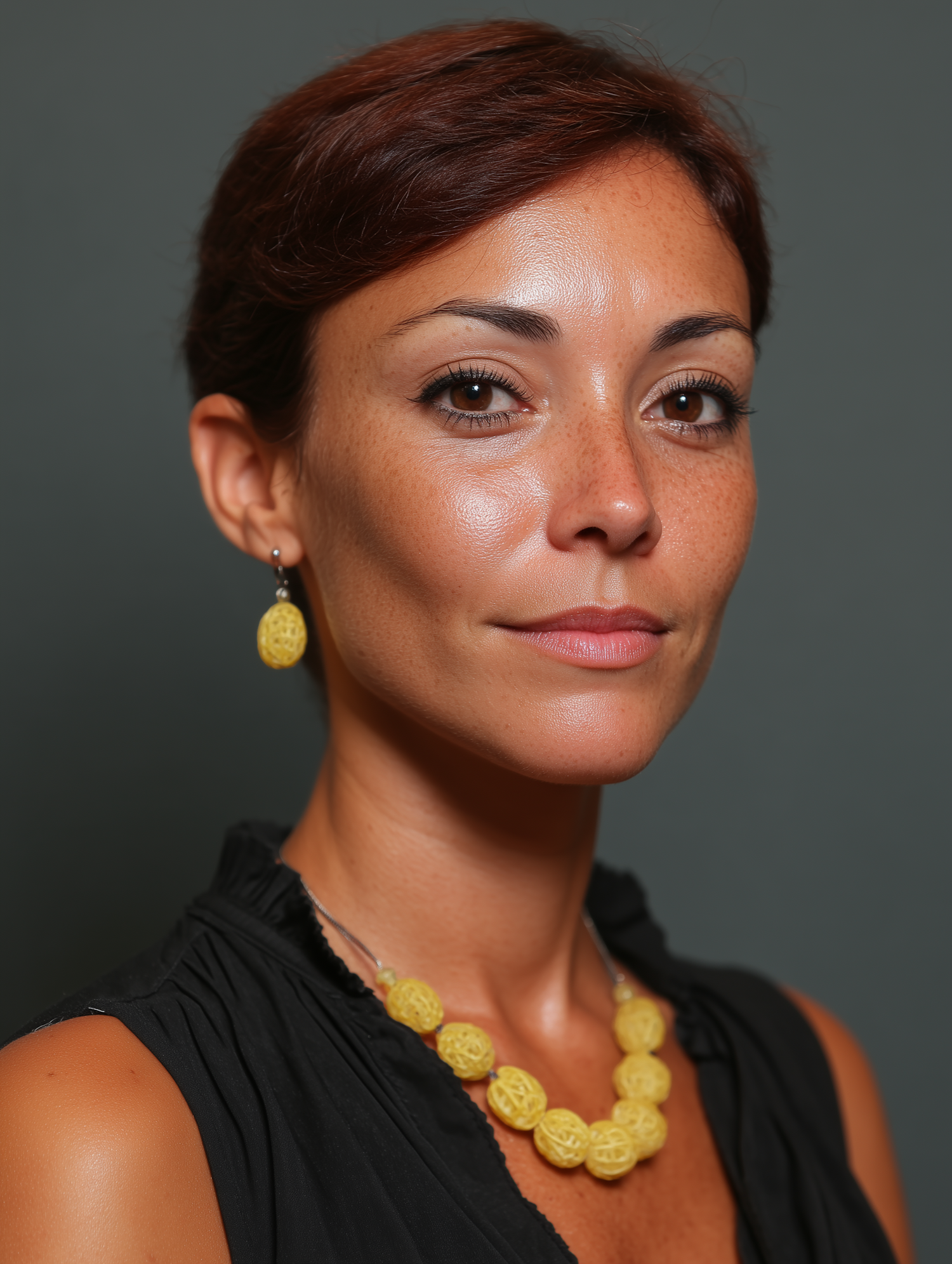 Close-up of a woman with freckles, short auburn hair, wearing yellow jewelry and a black top, set against a muted gray background.