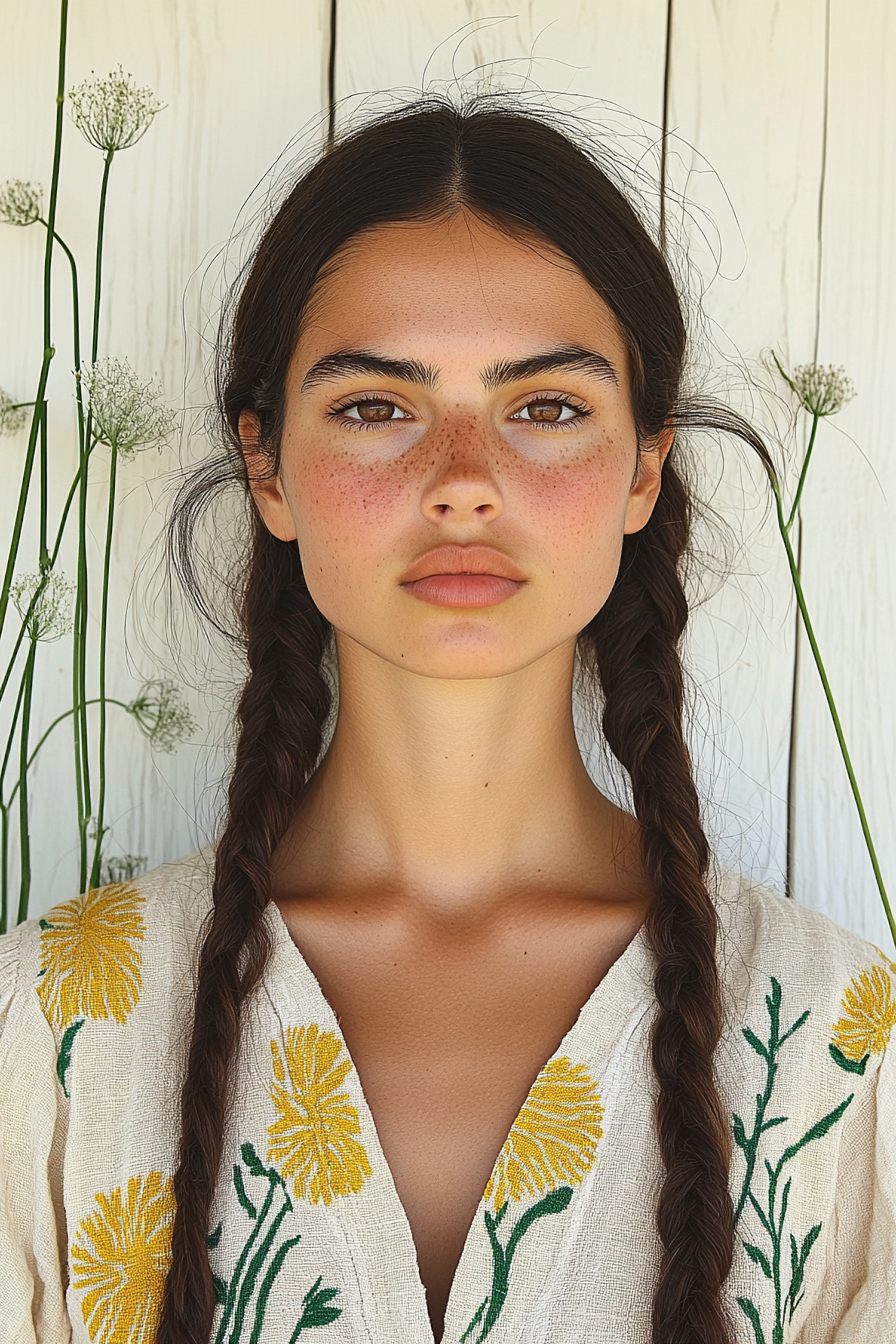 Young woman with braided hair, freckles, and a floral embroidered blouse, standing against a white wooden wall with delicate flowers.