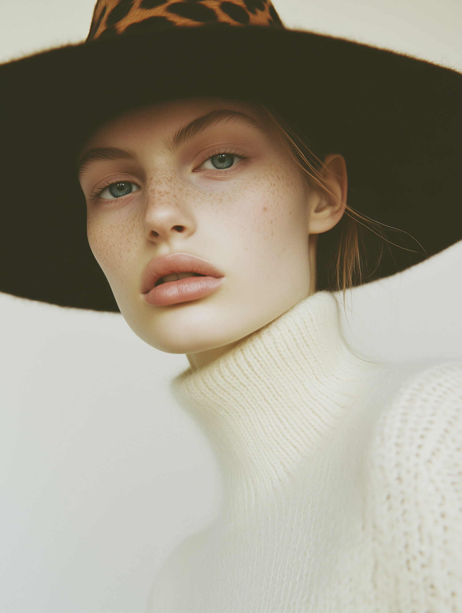 Close-up of a freckled woman in a leopard-accented black hat and cream knit sweater, exuding minimalist elegance.