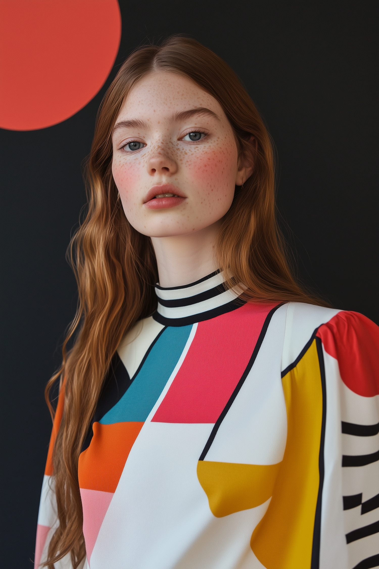 Freckled woman with auburn hair in a bold geometric-patterned top, set against a black background with a red circle. Modern and artistic vibe.