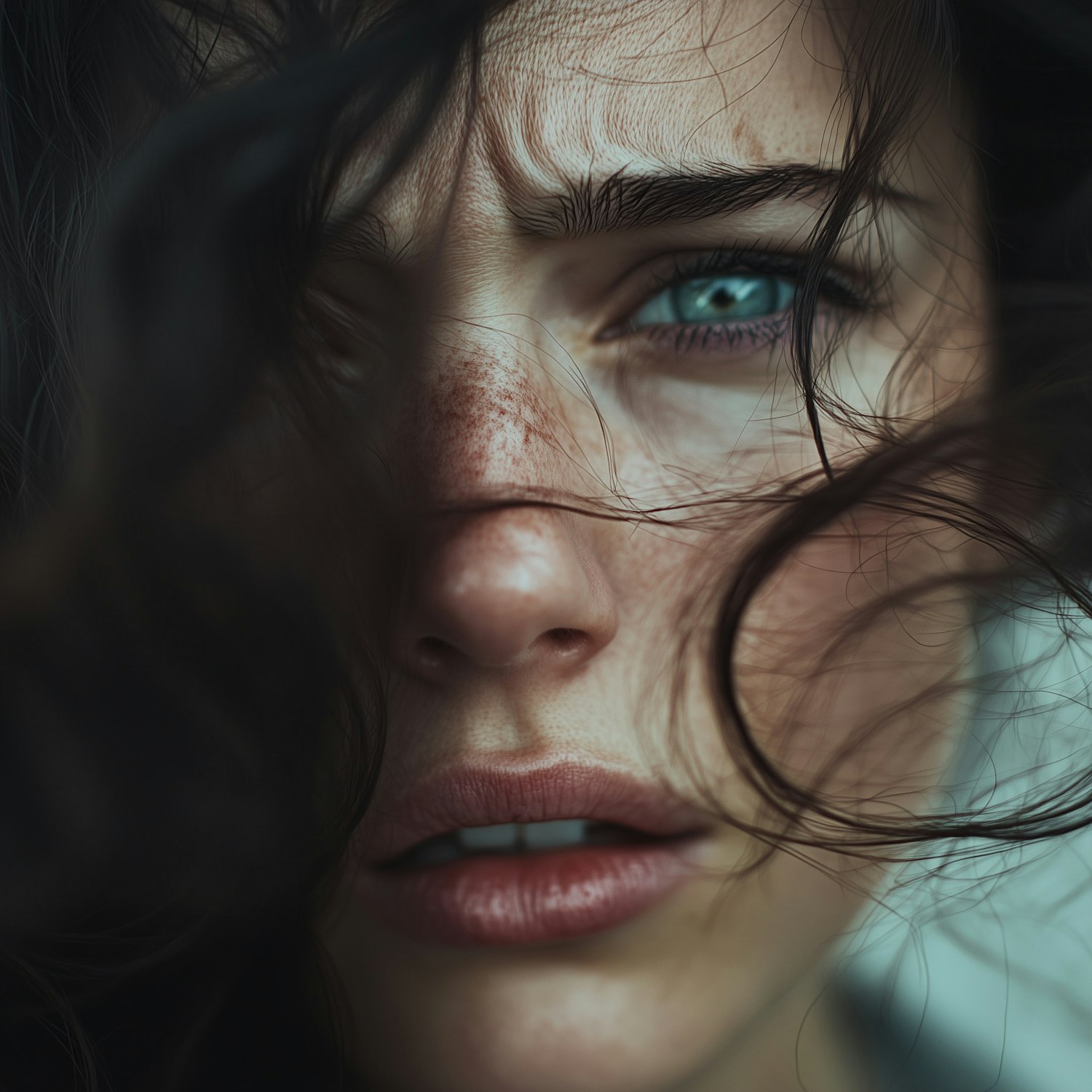 Close-up of a freckled woman with intense blue eyes, dark wavy hair, and a thoughtful expression, framed by soft lighting.