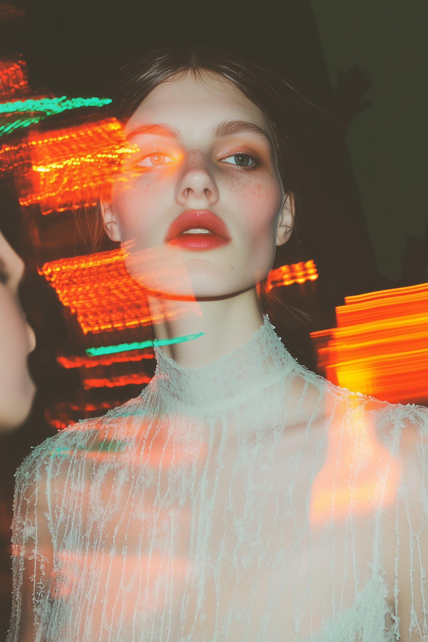 A striking portrait of a freckled woman in lace, with bold red lips and vibrant light streaks creating an artistic, surreal vibe.