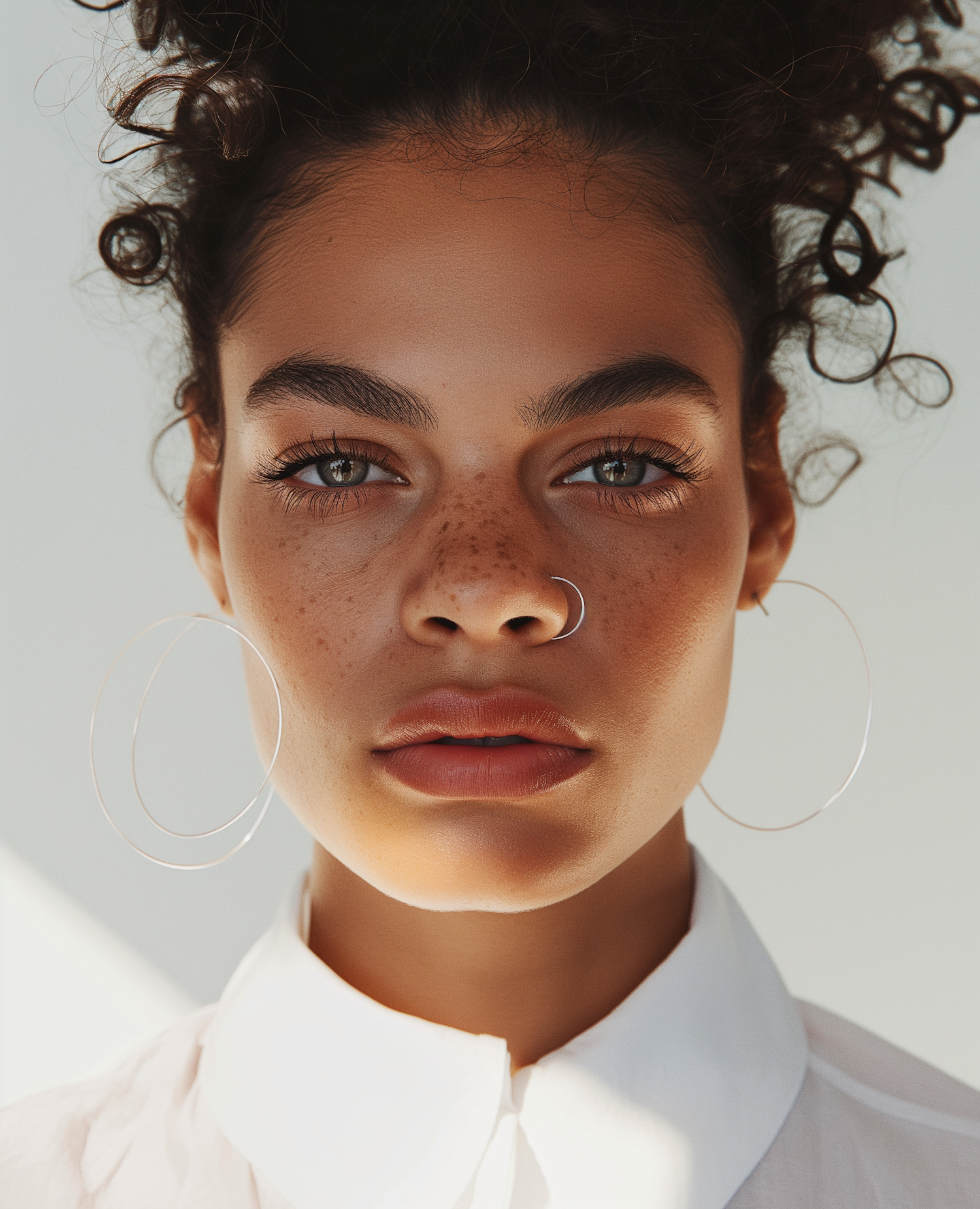 Close-up of a freckled woman with green eyes, curly hair, silver hoop earrings, and a nose ring, wearing a white shirt in soft lighting.