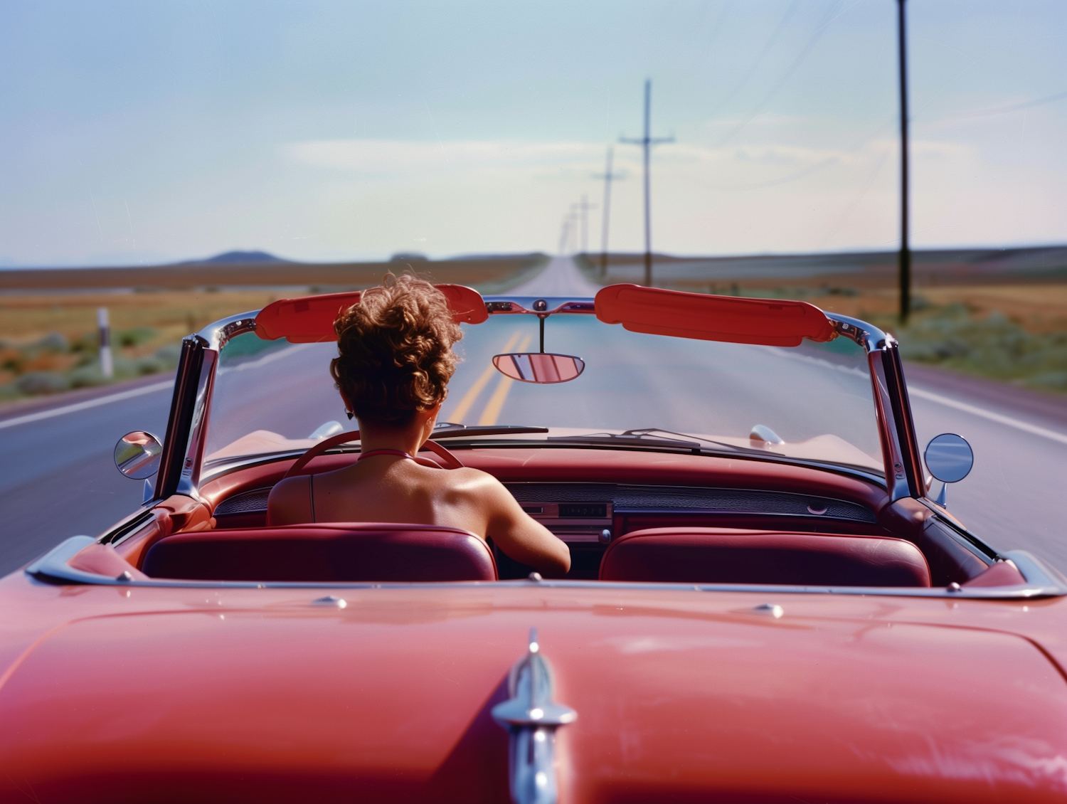 Woman with curly brown hair drives a classic red convertible on an open road, embodying freedom and adventure under a clear blue sky.