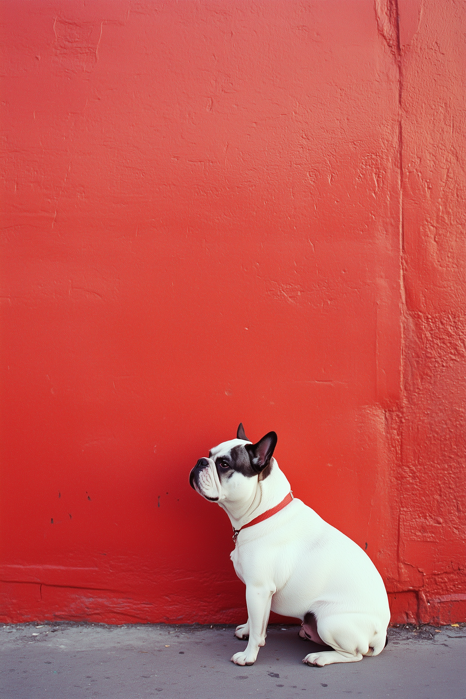 French Bulldog with a red collar sits against a vibrant red wall, creating a striking contrast.
