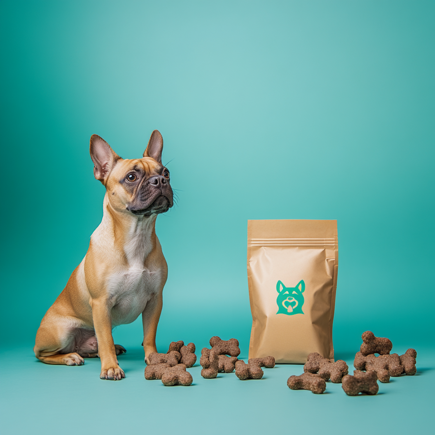 Adorable French Bulldog sitting next to a bag of dog treats on a teal background, surrounded by bone-shaped snacks.