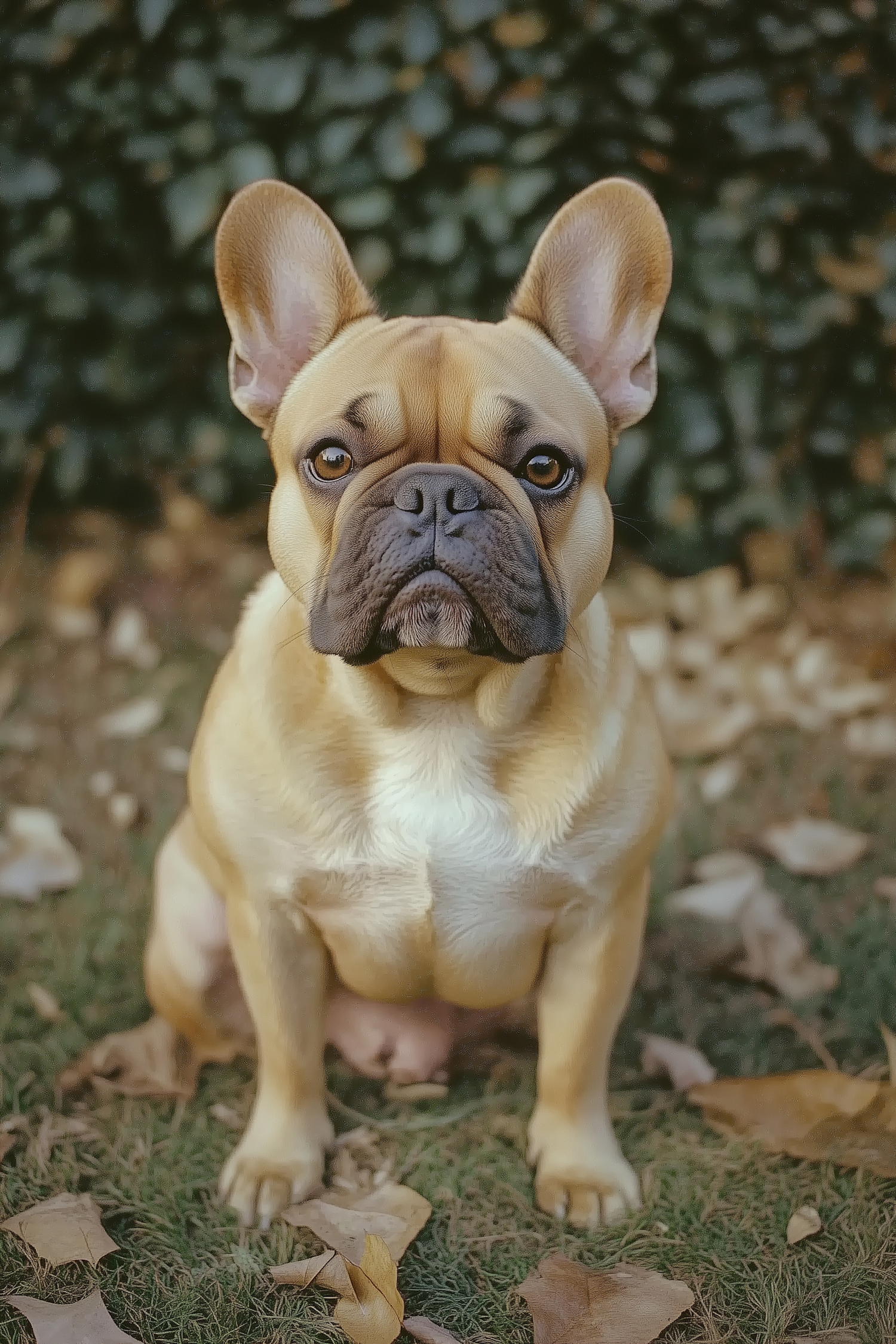 Adorable French Bulldog with fawn coat and dark mask sits on grass with autumn leaves, showcasing its alert and curious expression.