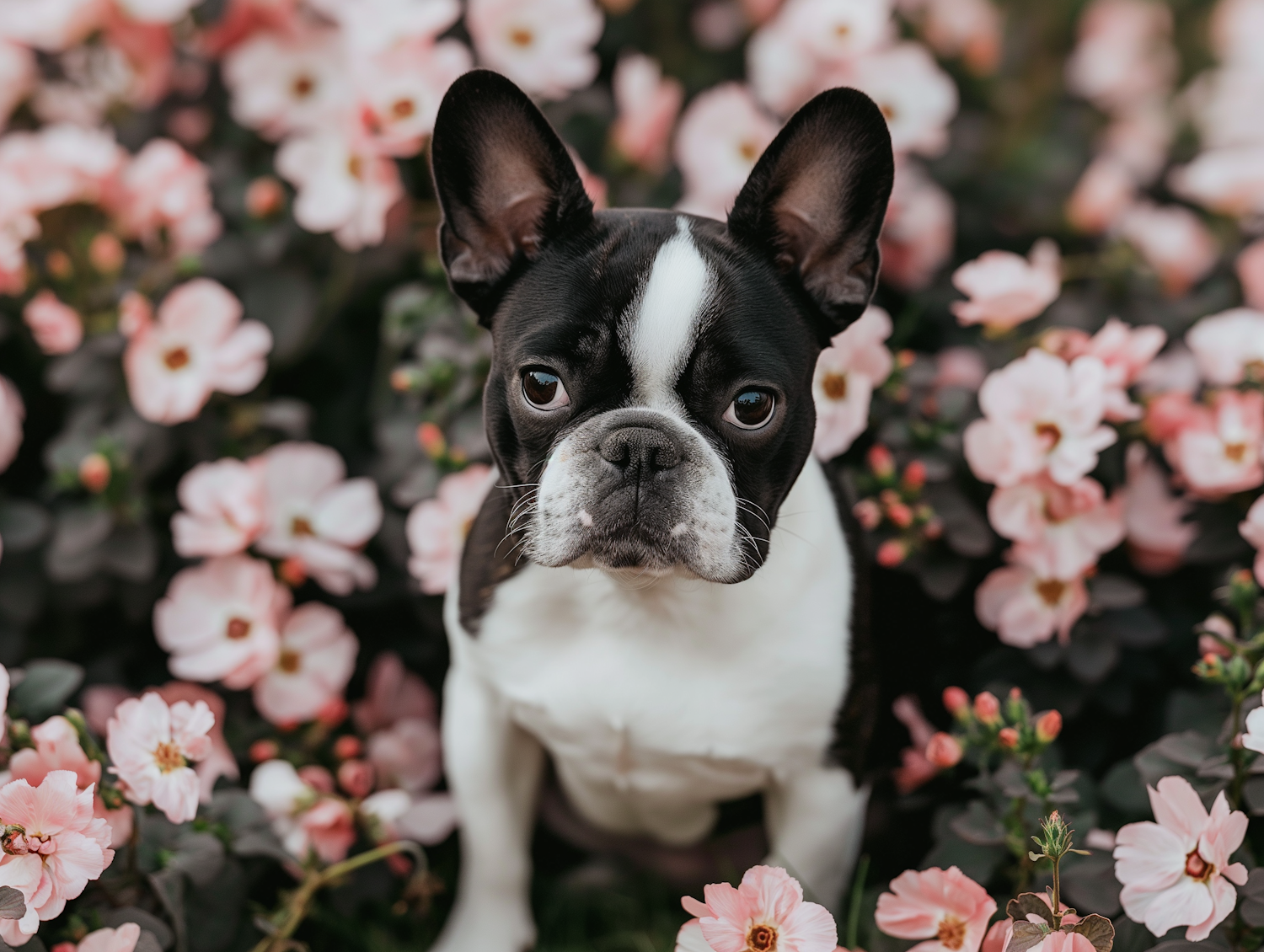 Adorable French Bulldog sitting among vibrant pink flowers, showcasing a serene and picturesque garden scene.