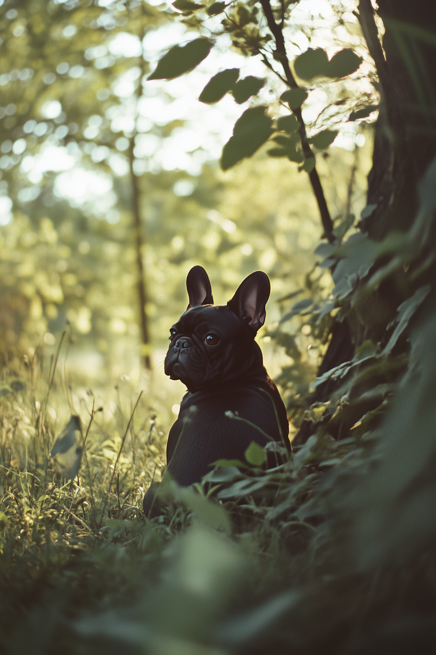 Black French Bulldog in a sunlit forest, surrounded by lush greenery, looking back with curious eyes. Tranquil and serene setting.