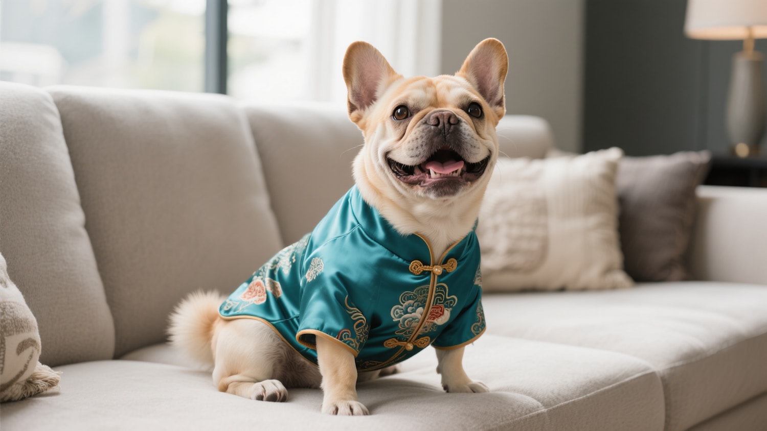 A professionally styled indoor fashion photoshoot featuring a small, joyful dog sitting playfully on a plush designer couch. The dog is wearing a high-quality, traditional Chinese-style top—made from fine silk or satin fabric with modern tailoring, subtle embroidery, and a clean, luxurious finish. The outfit is vibrant but elegant, fitting the dog perfectly and styled like a premium fashion piece. The dog is full of charm—bright, curious eyes, a soft open-mouth smile, and a slightly tilted head, giving a warm, joyful, and approachable vibe. Ideal breeds for the scene could include a French Bulldog, Pekingese, Pomeranian, or Shih Tzu—something compact, expressive, and fashionable. The setting is a cozy, modern living room, with a neutral-toned designer couch (cream, grey, or muted earth tones) that contrasts gently with the dog’s outfit. Decorative cushions or soft throws may add texture, but nothing distracts from the subject. Lighting is soft, natural, and editorial—think high-end product campaign. Window light or soft studio diffused lighting highlights the silk texture of the outfit and the fur detail without harsh shadows. The shot is composed with negative space for potential text overlay—perfect for a homepage hero section. The overall aesthetic is clean, photorealistic, and brand-driven: modern luxury with a playful, cultural twist. Style: High-resolution, studio-quality fashion photography. Warm, joyful, premium.*