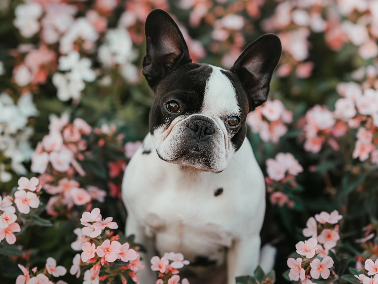 Adorable French Bulldog surrounded by blooming pink flowers, creating a charming and serene garden scene.