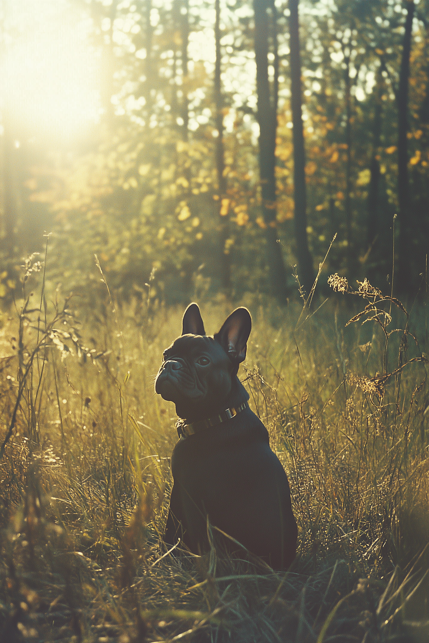 Black French Bulldog in a sunlit meadow, surrounded by tall grasses and trees, with a warm, golden glow from the sunlight.